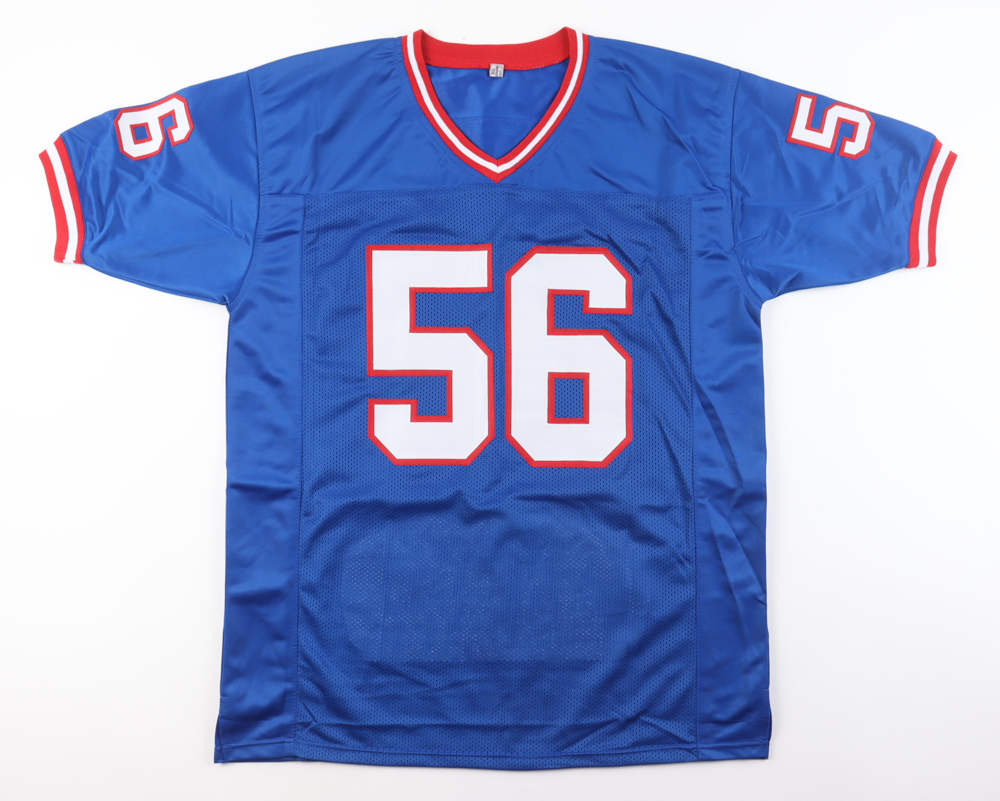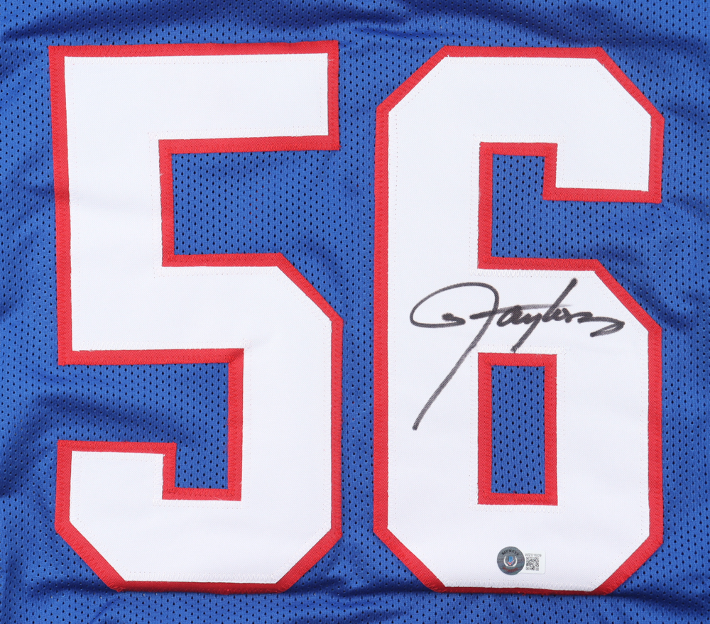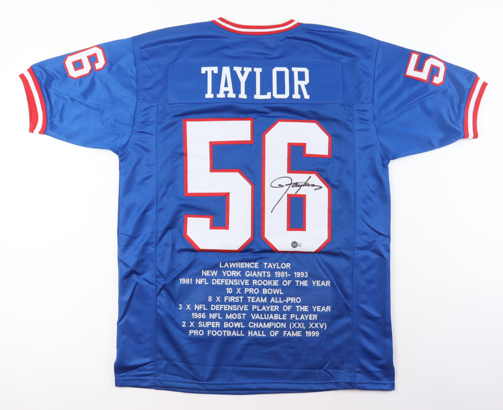 Custom jersey. Everything is sewn on, size XL. Hand-signed by Lawrence Taylor (HOF). Taylor's career stats have been custom stitched in the jersey below the reverse numbers.