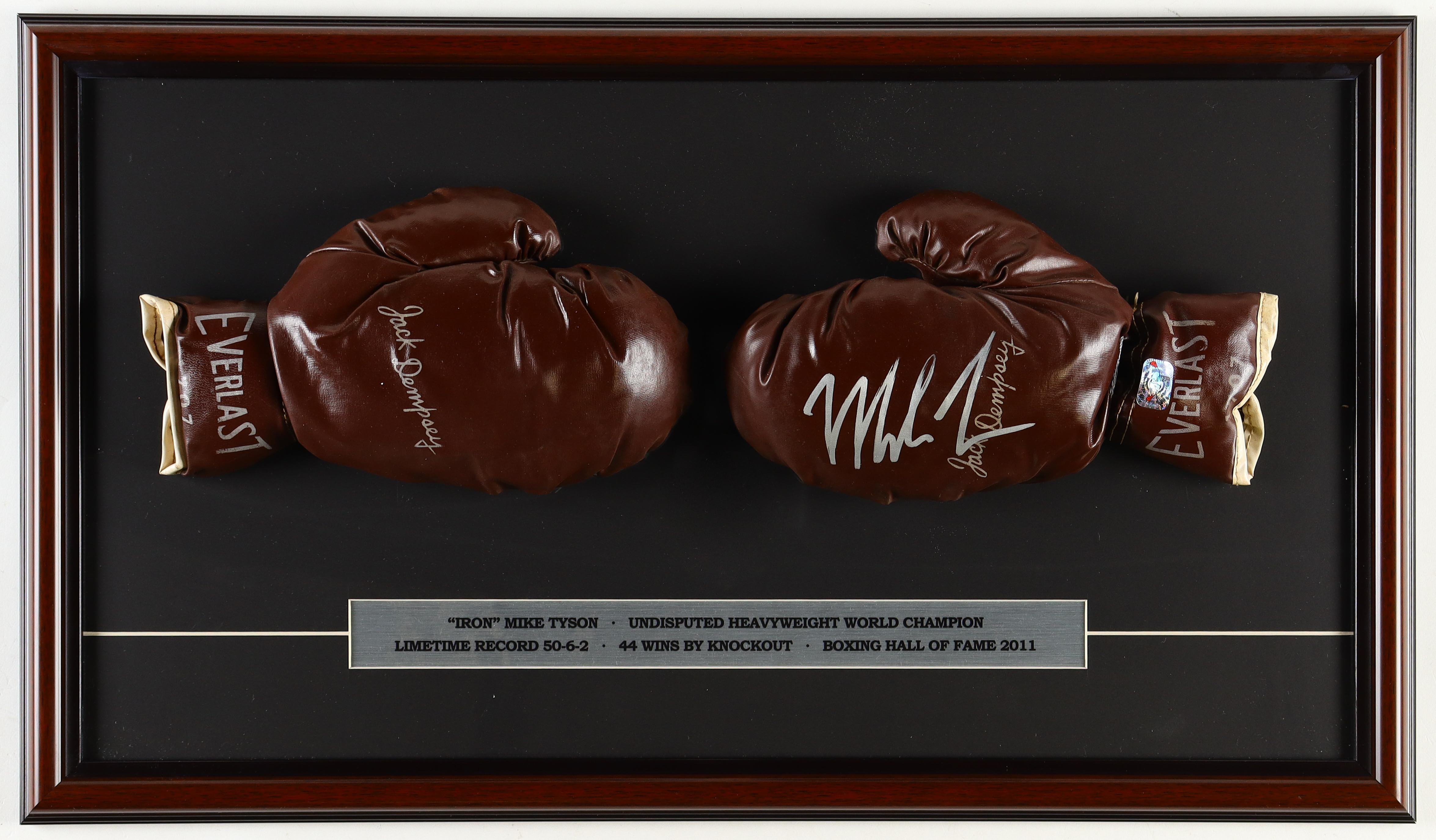 Custom frame measures approximately 15" x 26" in size and features a set of (2) Everlast Boxing Gloves, the left glove has been hand-signed by Mike Tyson (HOF).