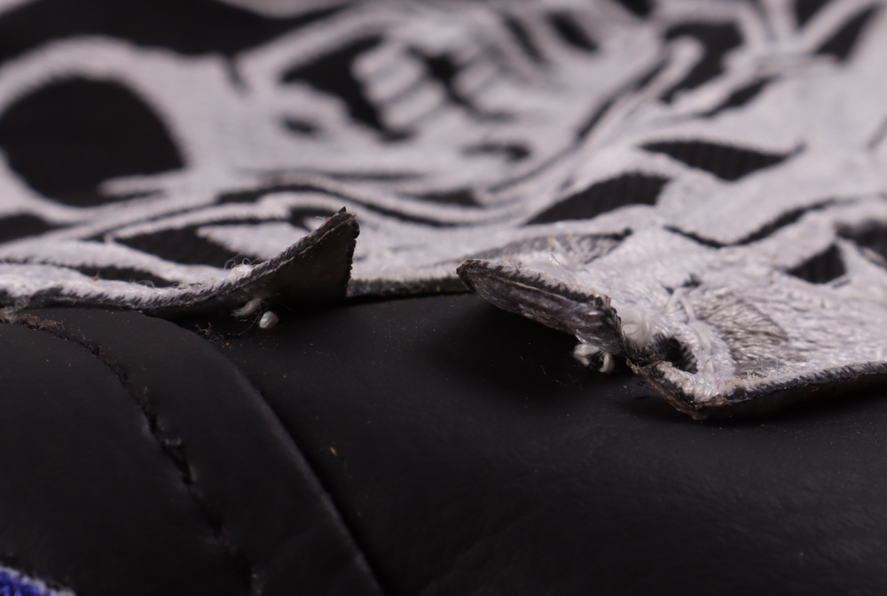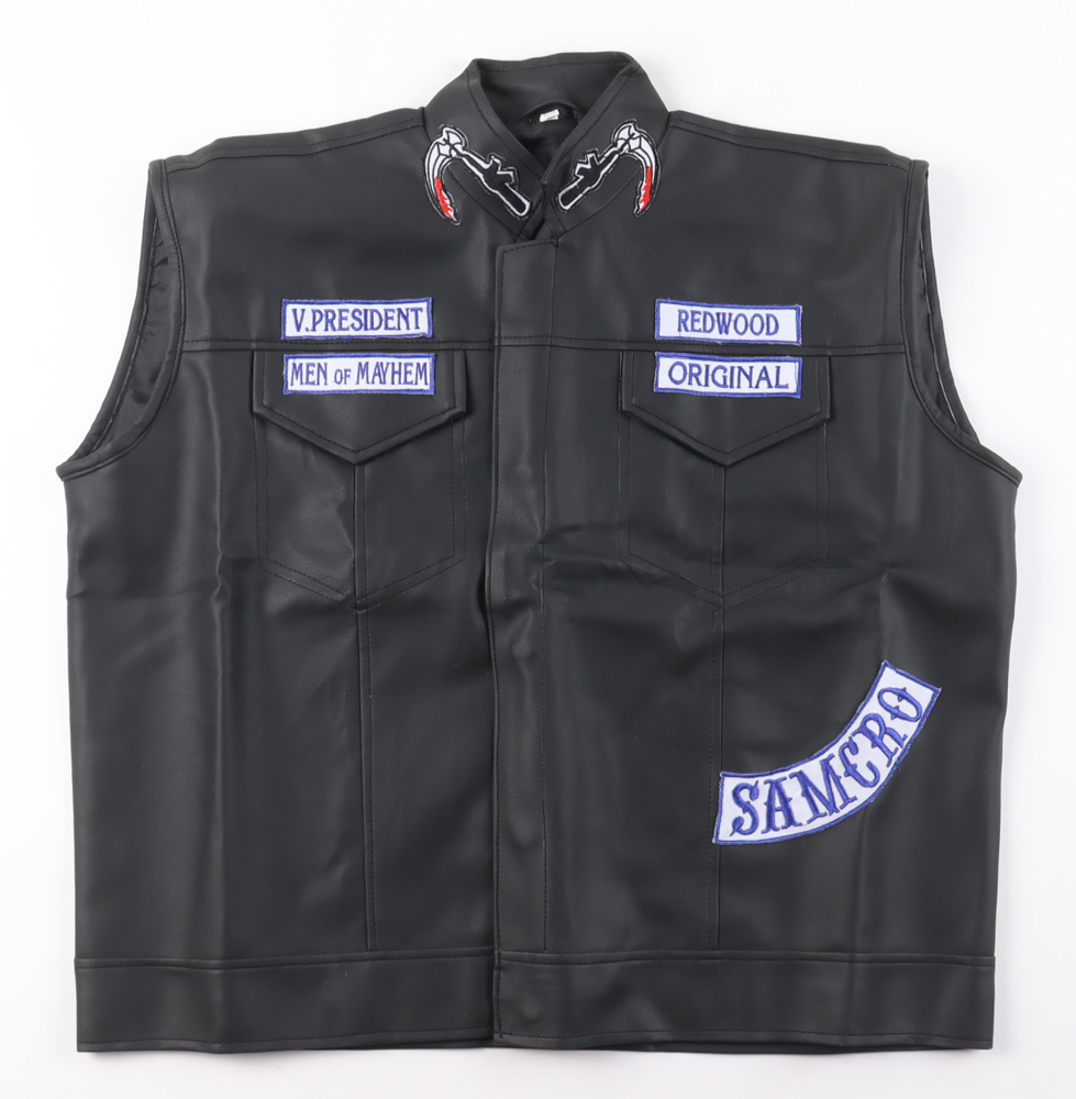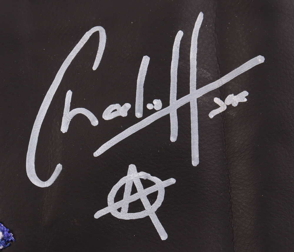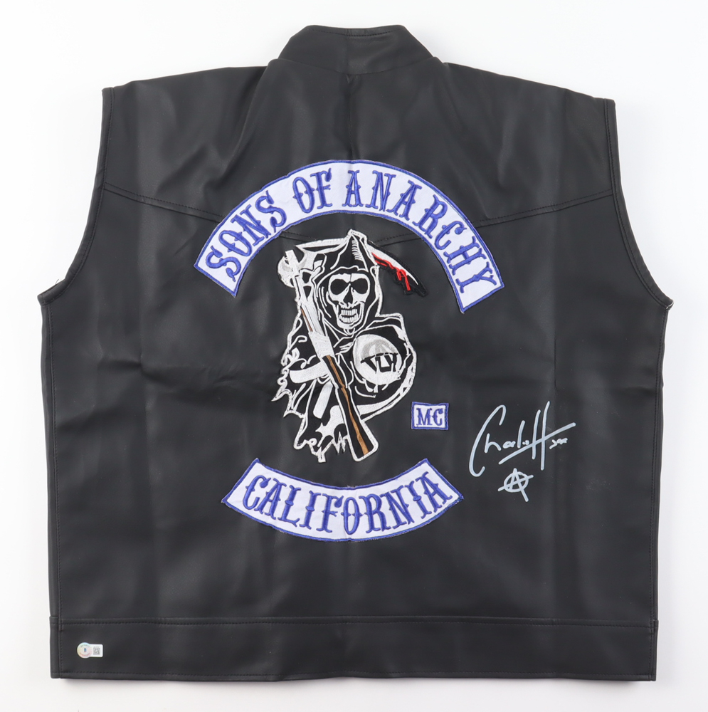 Sons of Anarchy replica vest with everything sewn on. size L. Hand-signed and inscribed by Charlie Hunnam. Please note, the logo is slightly peeling off and there is a small red streak on the back.