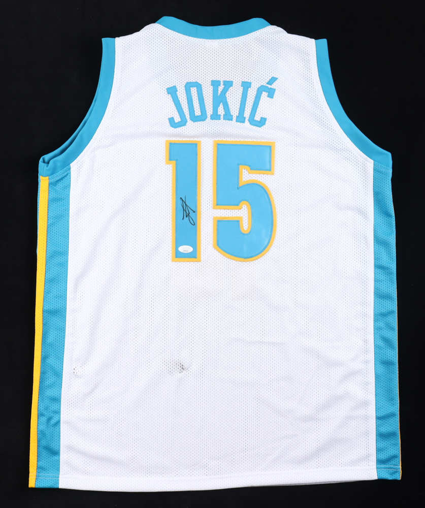Custom jersey with everything sewn on, size XL. Hand-signed by Nikola Jokic. Please note, there are burn marks on the front and back of the jersey.