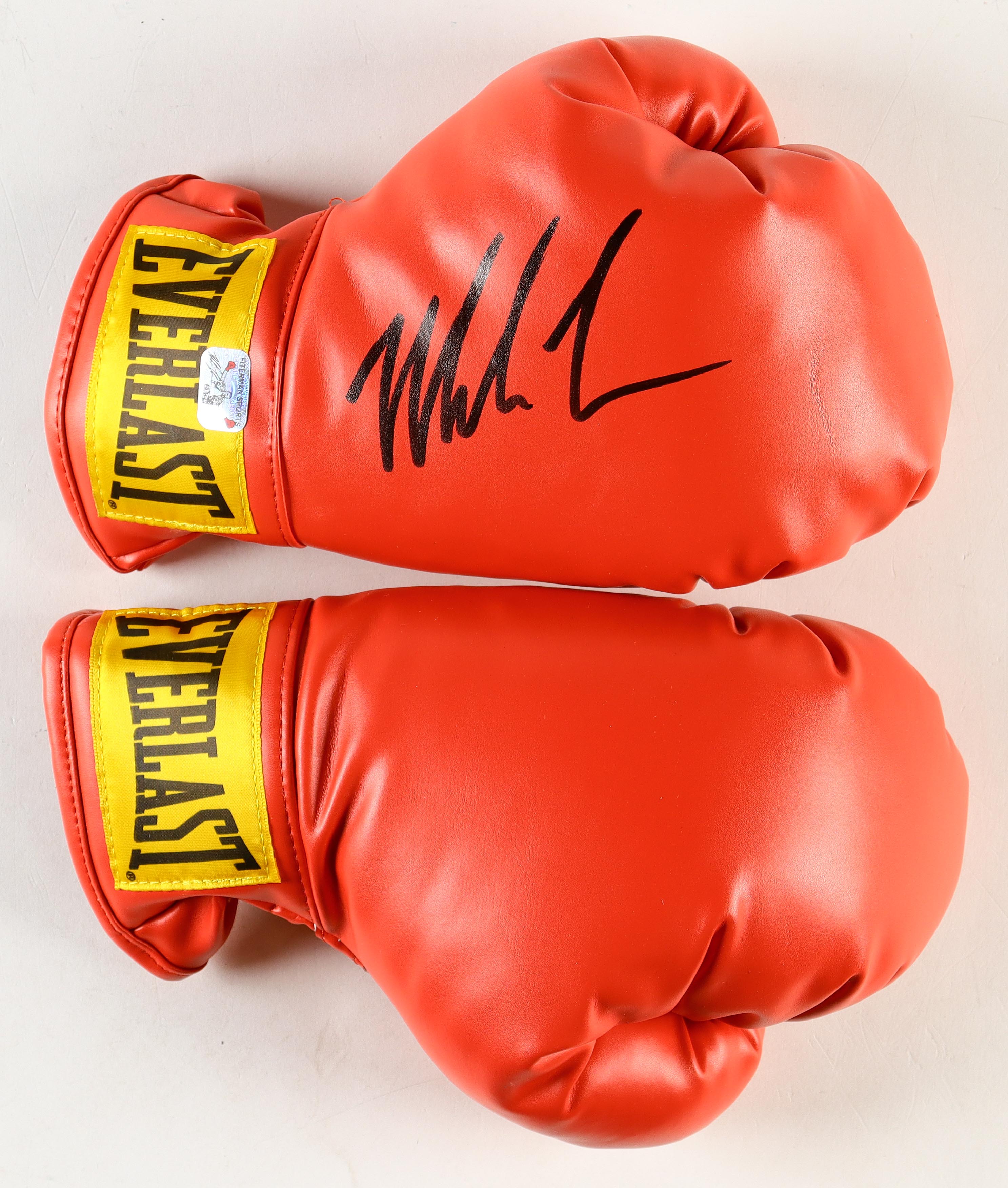 Pair Of Everlast boxing gloves has been hand-signed on the right glove by Mike Tyson (HOF). Display case and wraps included as shown.