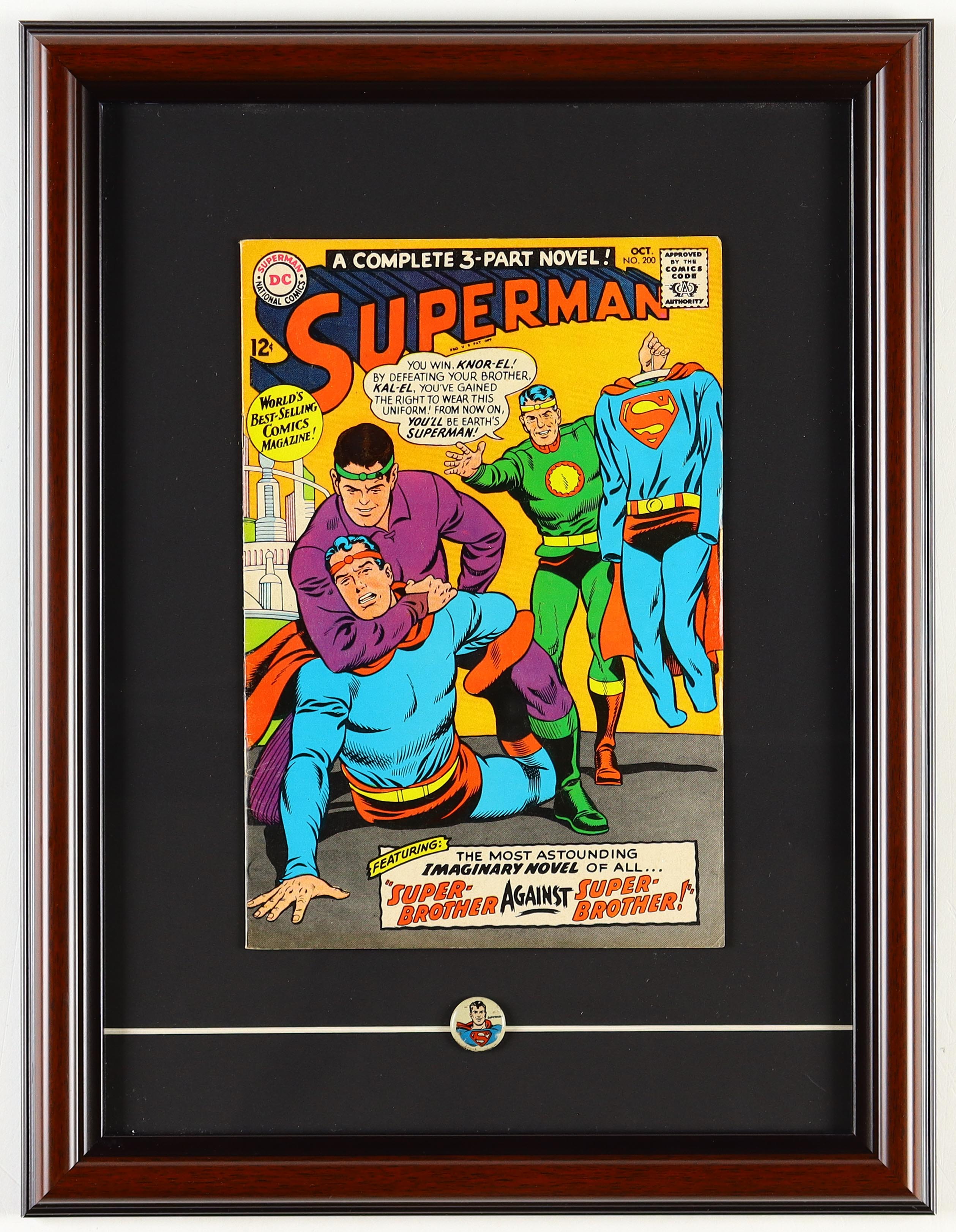 1967 "Superman" Issue #200 DC Custom Framed Comic Book Display with Vintage Superman Lapel Pin