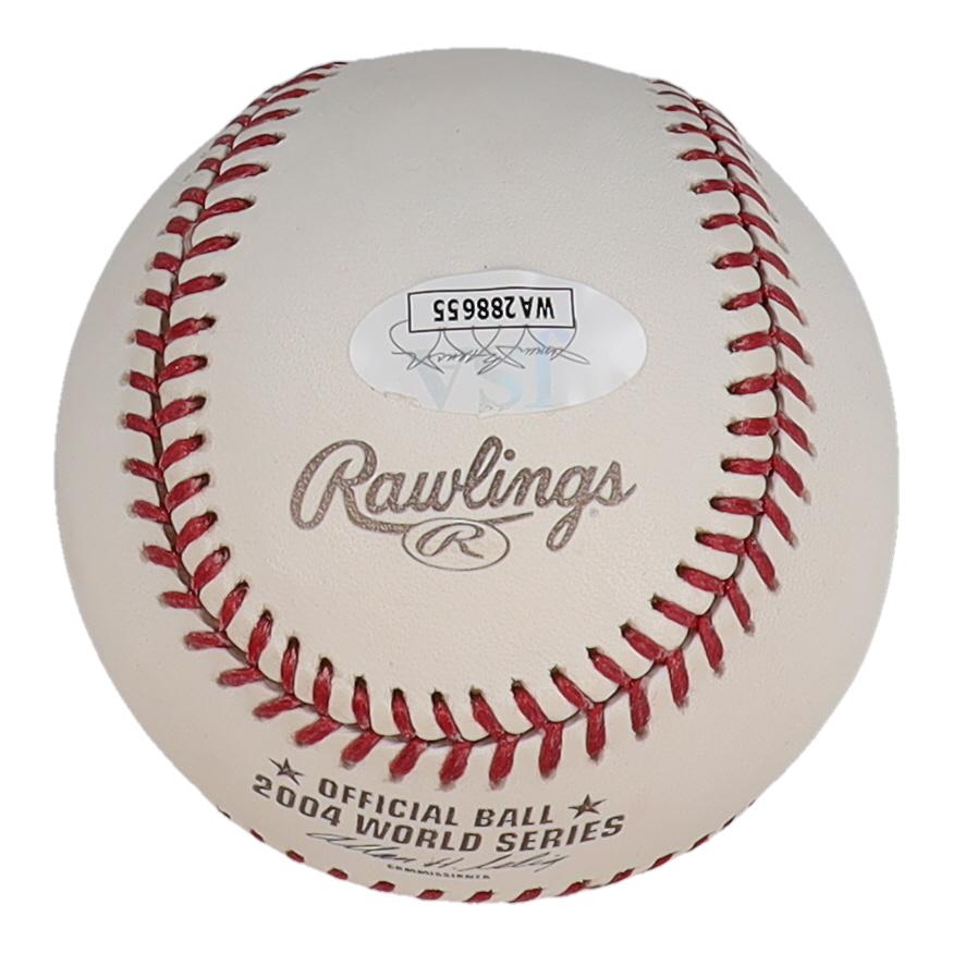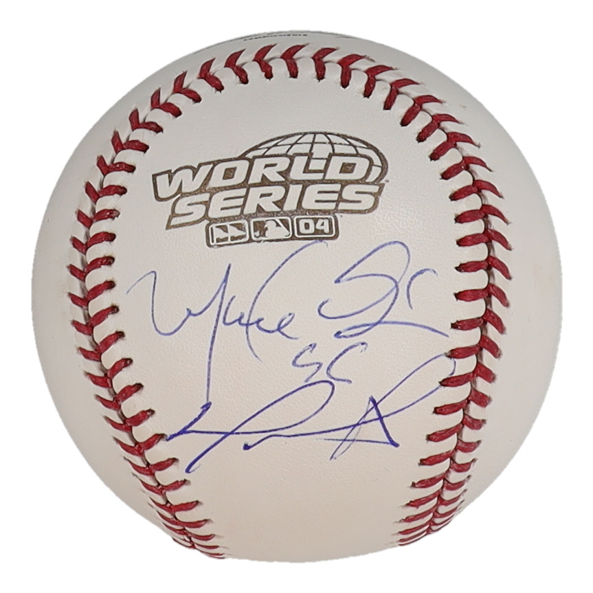 Rawlings Official 2004 World Series baseball. Hand-signed by Manny Ramirez (Boston Red Sox) and David Ortiz (Boston Red Sox, HOF).