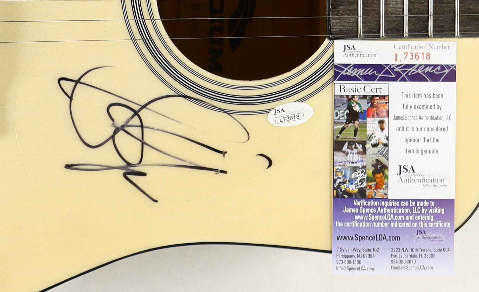 Stadium acoustic guitar measures approximately 40" in length and has been hand-signed on the pick-guard by Steven Tyler.