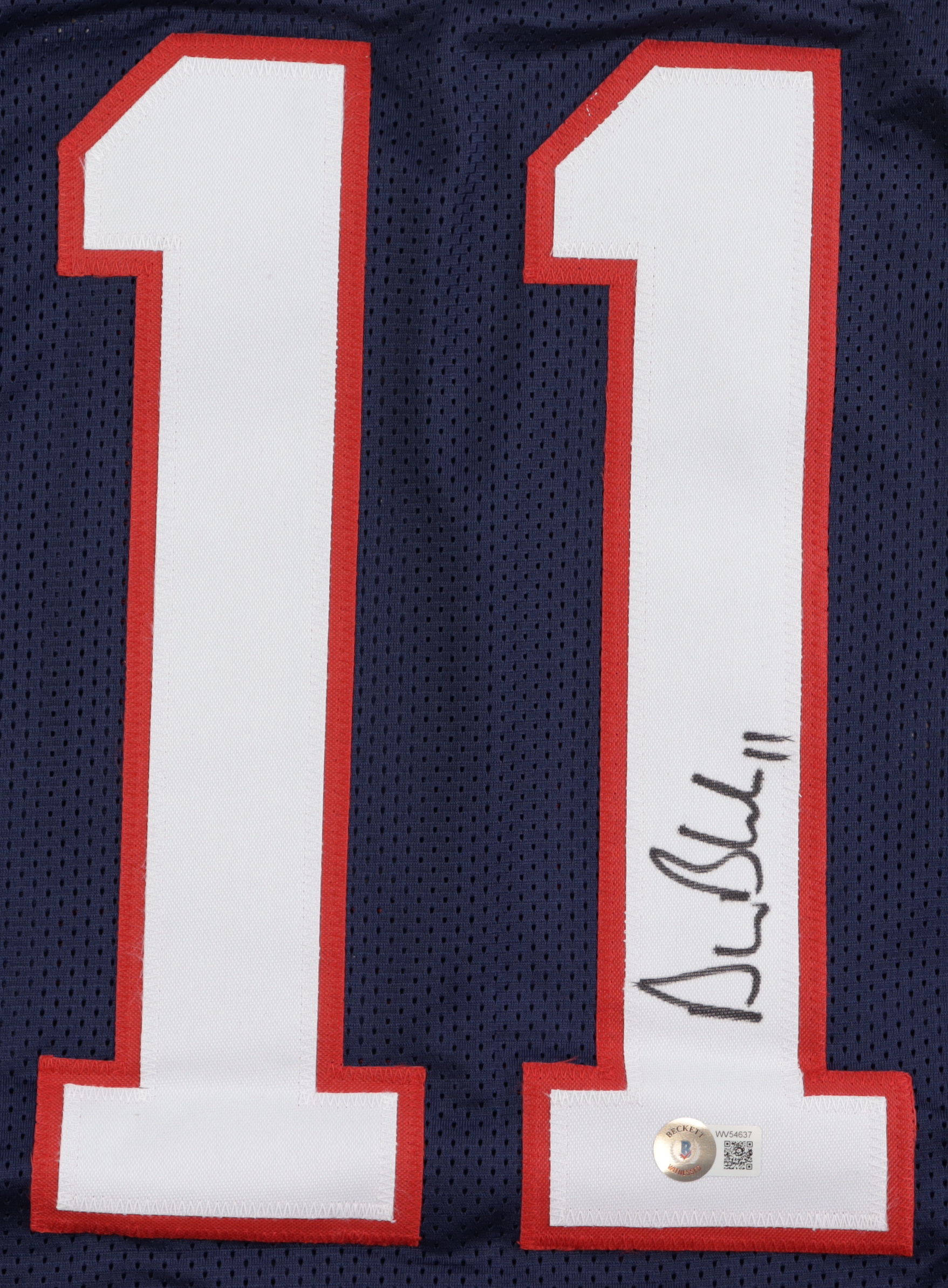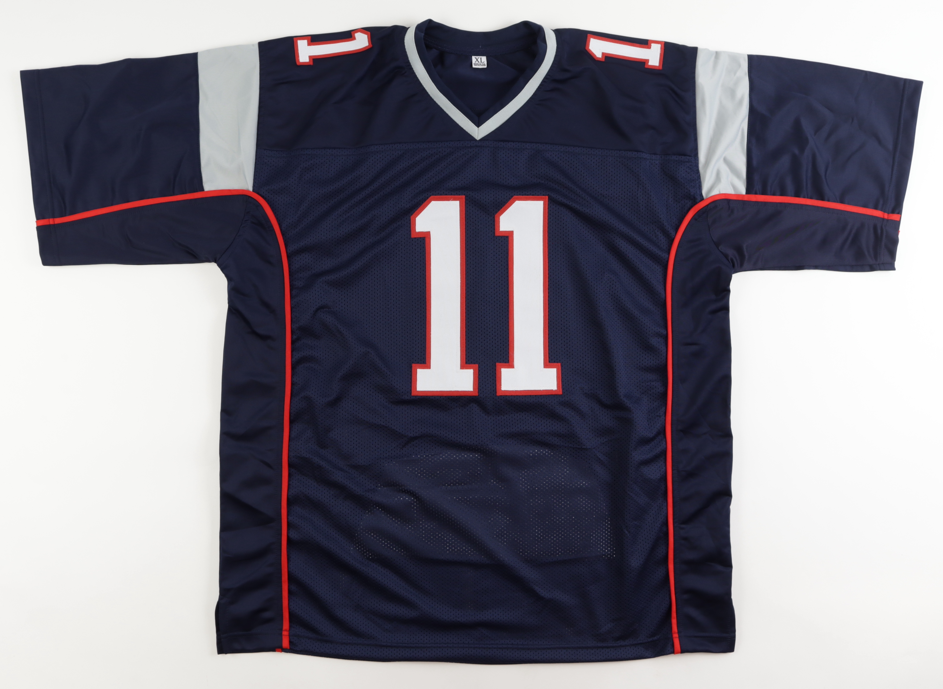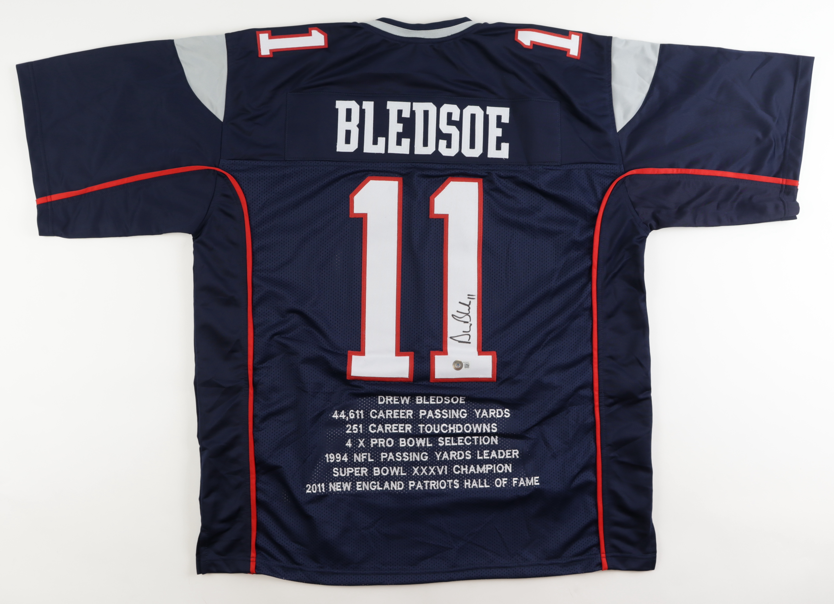 Custom jersey. Everything is sewn on, size XL. Hand-signed by Drew Bledsoe. Bledsoe's career highlights have been custom stitched onto the back of the jersey below the reverse numbers.