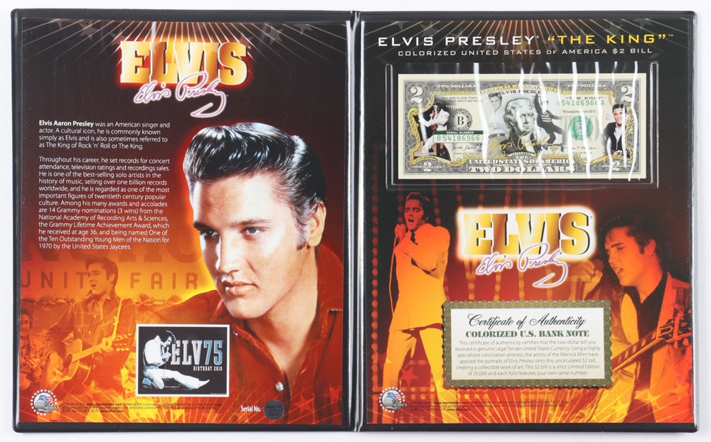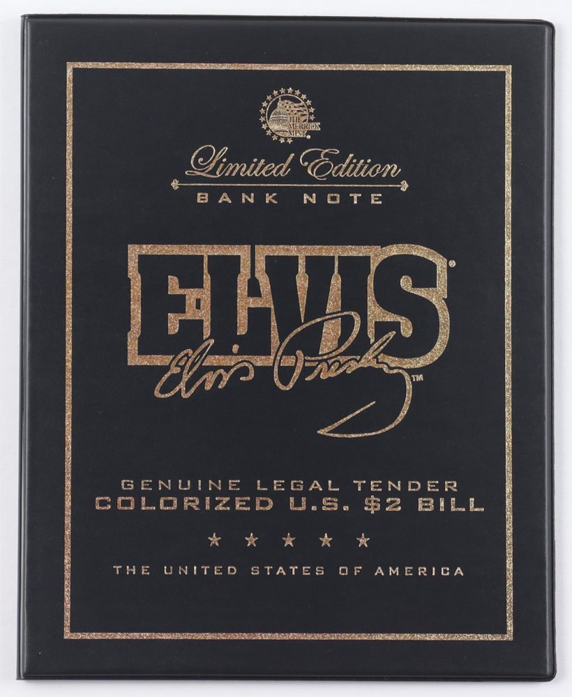 Elvis Presley Genuine Legal Tender Colorized U.S. $2 Bill Commemorative Edition Bank Note. Includes folder as shown. Please note, Presley's autograph is a facsimile.