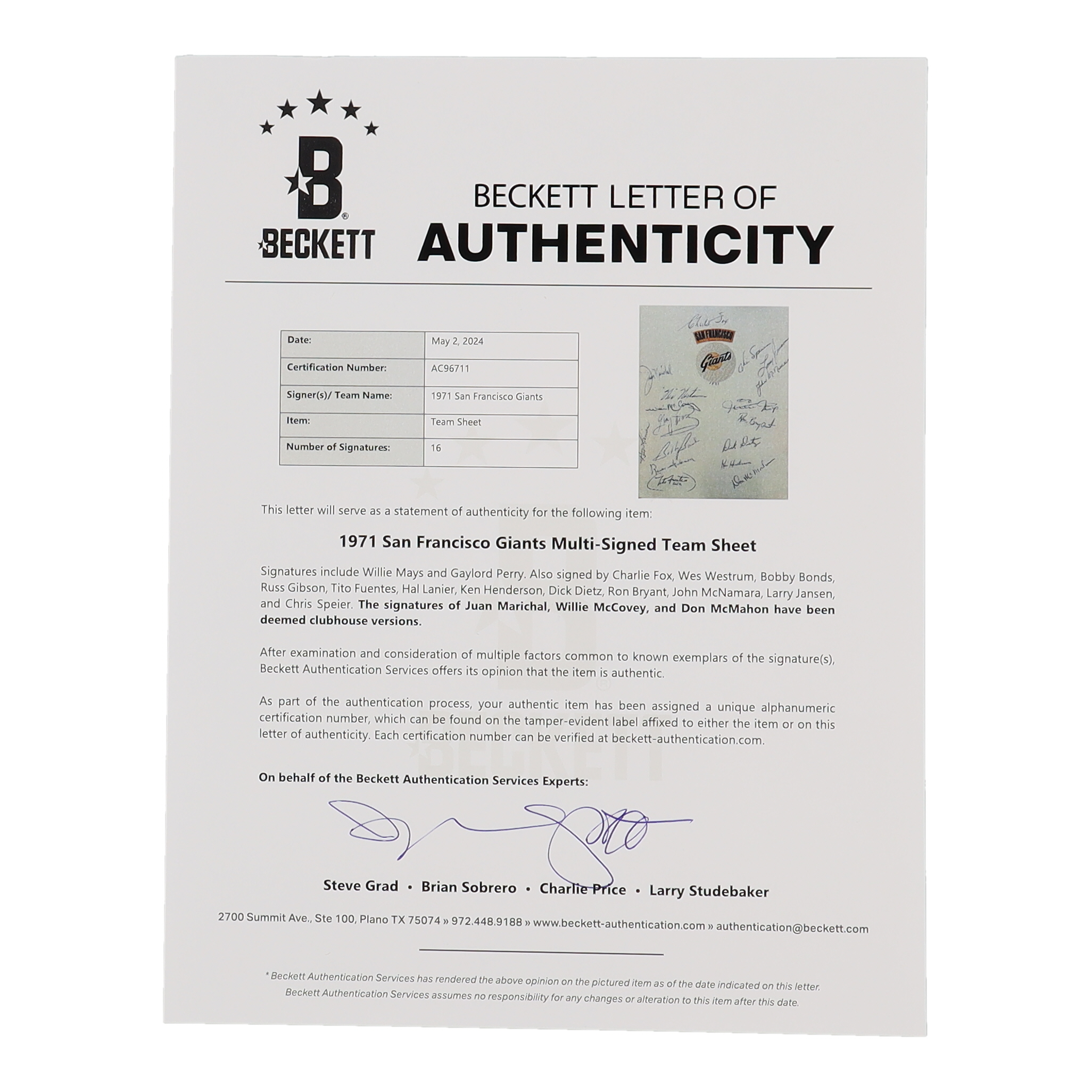 1971 San Francisco Giants Team sheet measures 8" x 10" in size. Hand-signed by Willie Mays, Gaylord Perry, Charlie Fox, Wes Westrum, Bobby Bonds, Russ Gibson, Tito Fuentes, Hal Lanier, Ken Henderson, Dick Dietz, Ron Bryant, John McNamara, Larry Jansen, Chris Speier. Please note, the signatures of Juan Marichal, Willie McCovey & Don McMahon have been deemed clubhouse versions. Please refer to photos for more details on the condition of the item.
