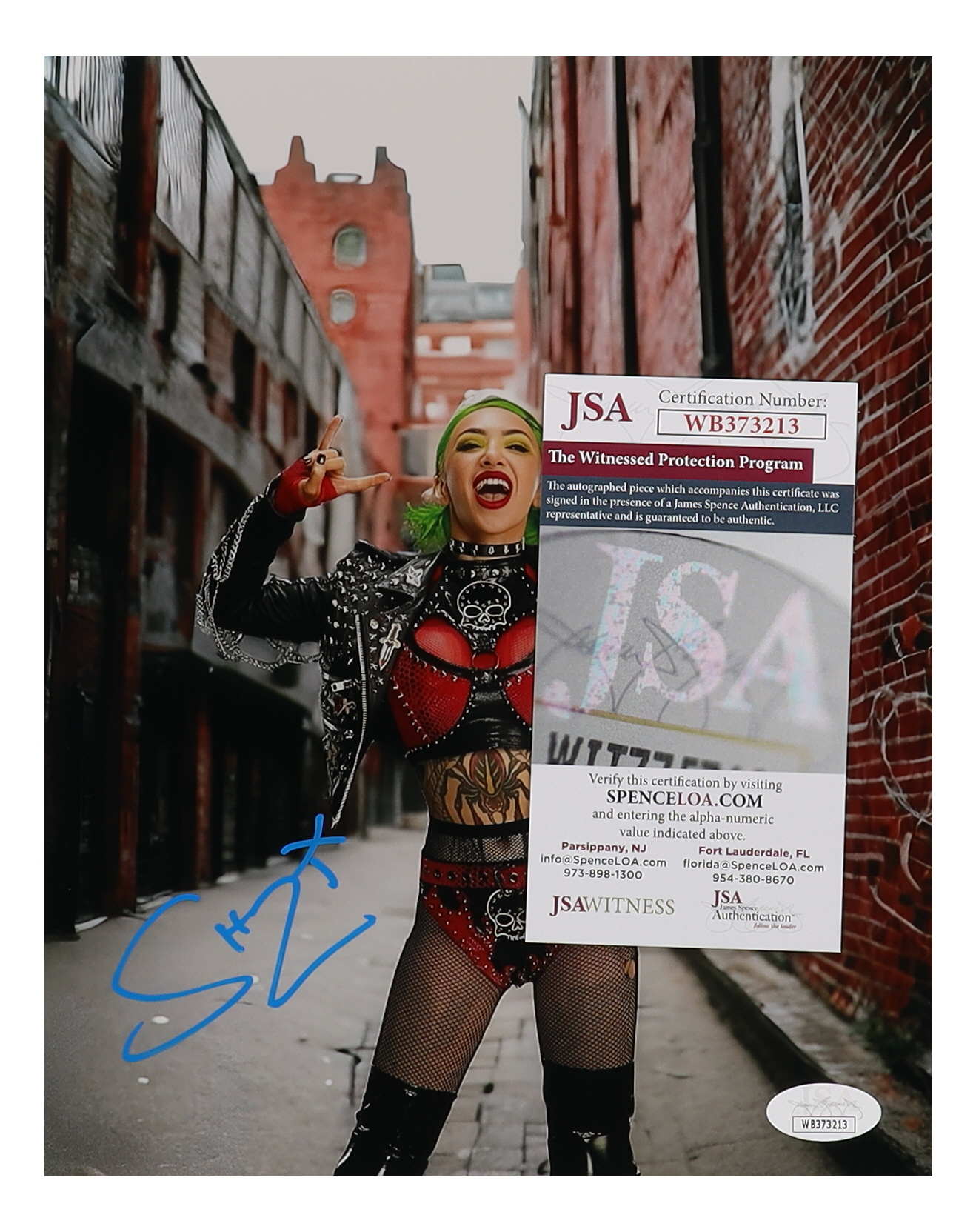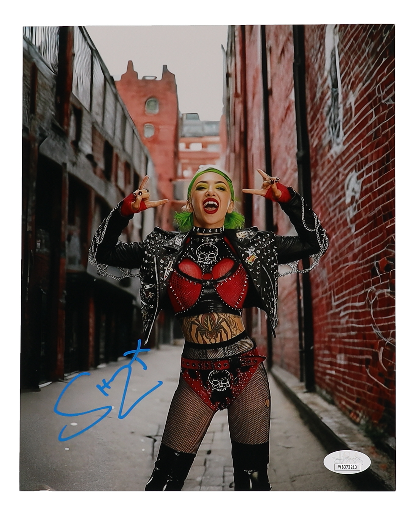 Photo measures 8" x 10" in size and has been hand-signed by Shotzi Blackheart. Please note, the bottom left corner is creased.