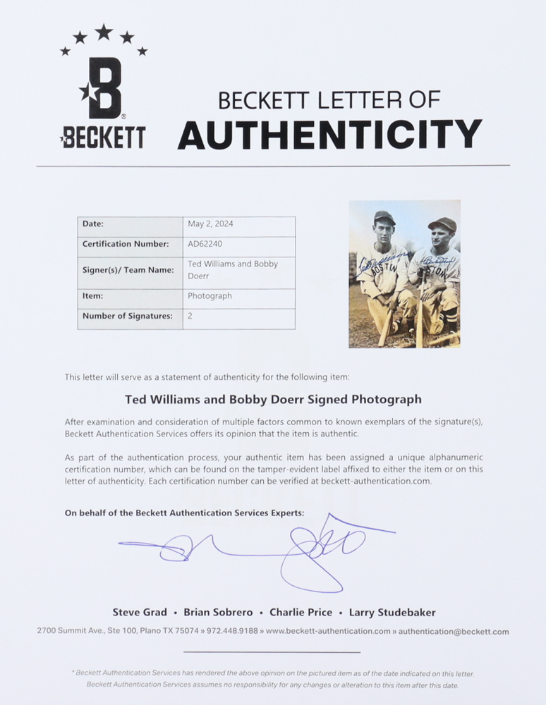 Photo measures 16" x 20" in size and has been hand-signed by Ted Williams (D. 2002, Boston Red Sox, HOF) and Bobby Doerr (D. 2017, Boston Red Sox, HOF). Please note, there is wrinkling and slight creasing as well as corner wear on the photo.