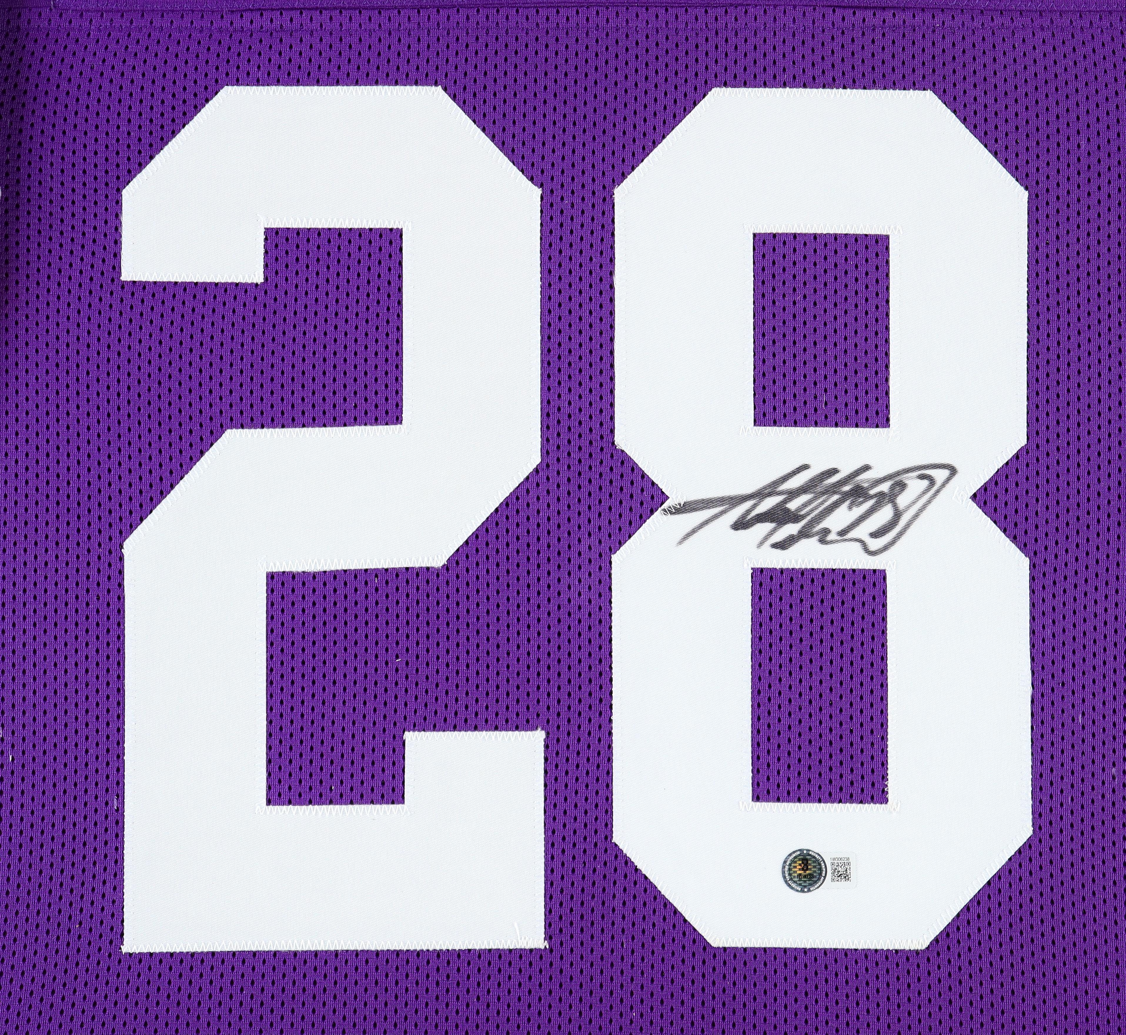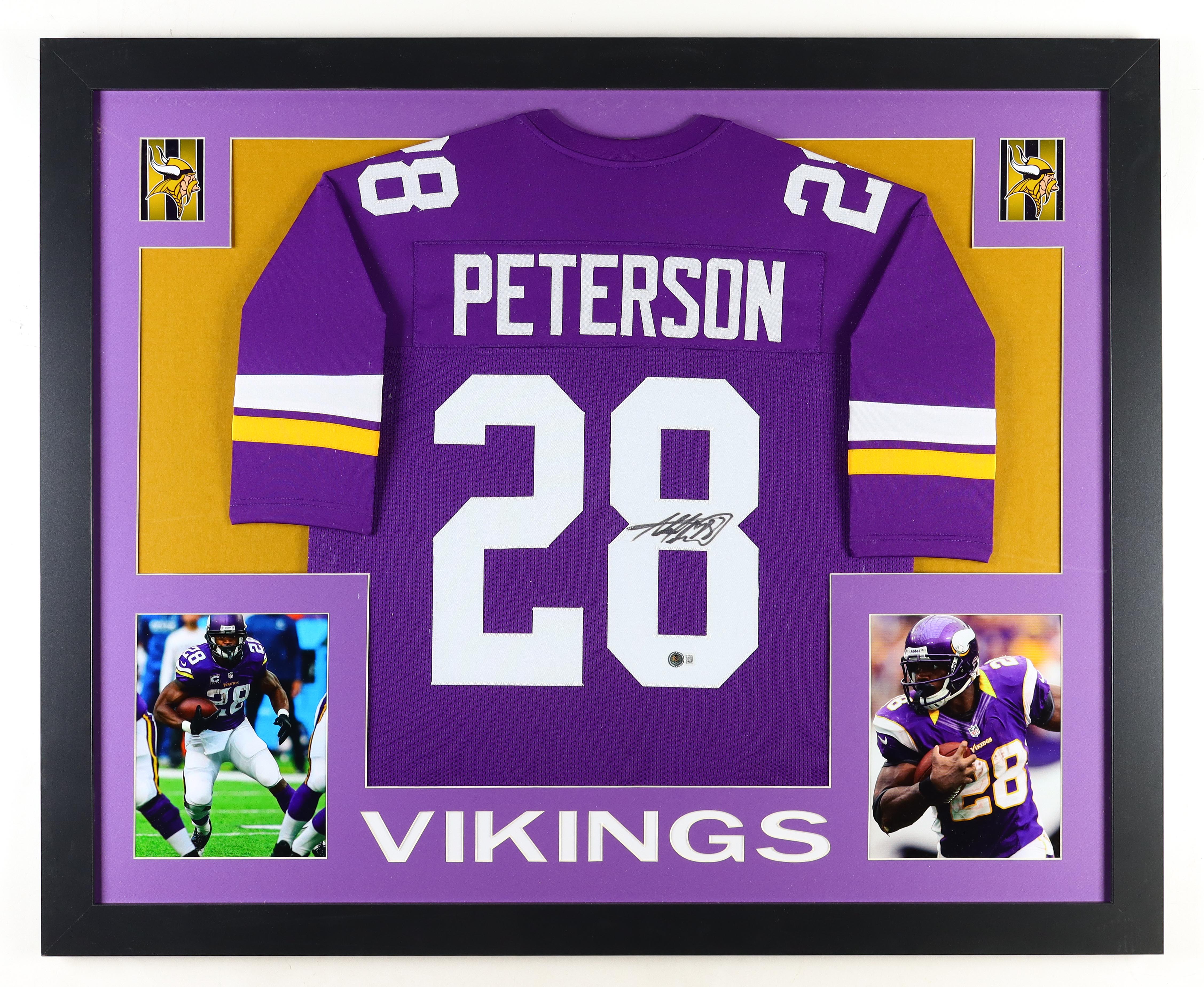 Custom frame measures 35.5" x 43.5" in size and features a jersey that has been hand-signed by Adrian Peterson.