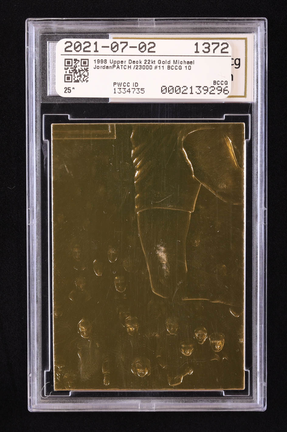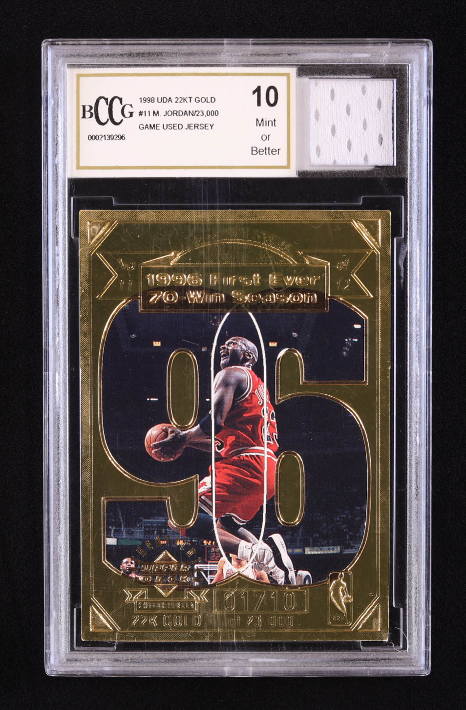 Michael Jordan 1998 Upper Deck 22K Gold Michael Jordan #11 with Game-Used Jersey Piece (BCCG 10)