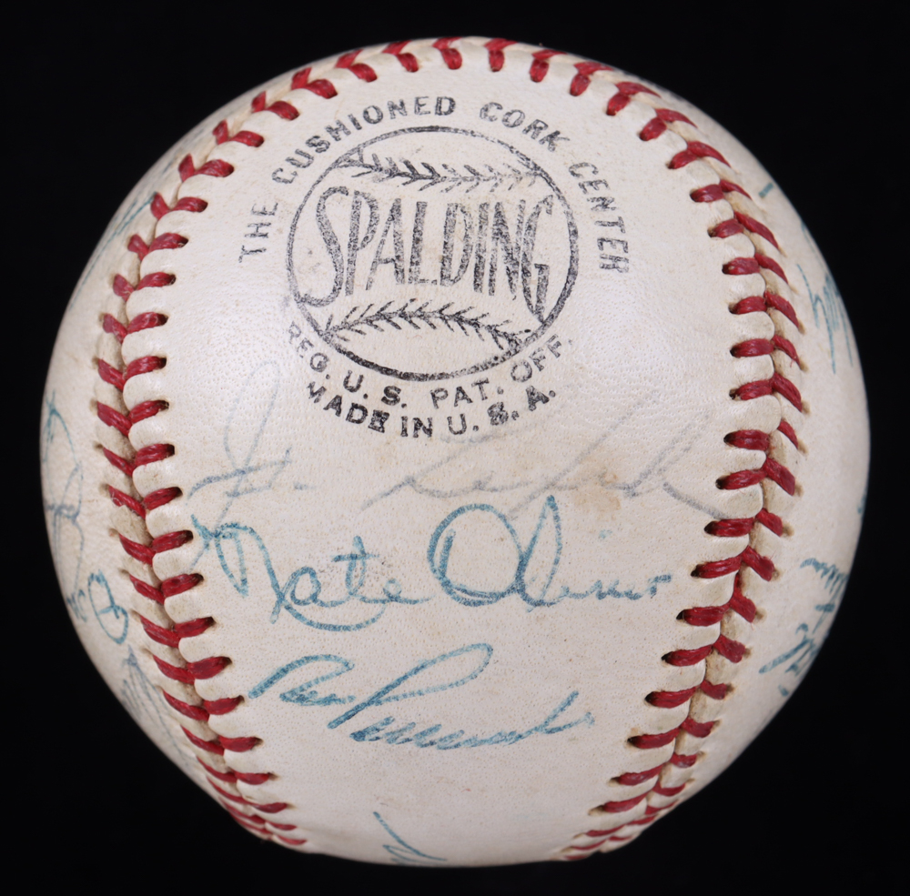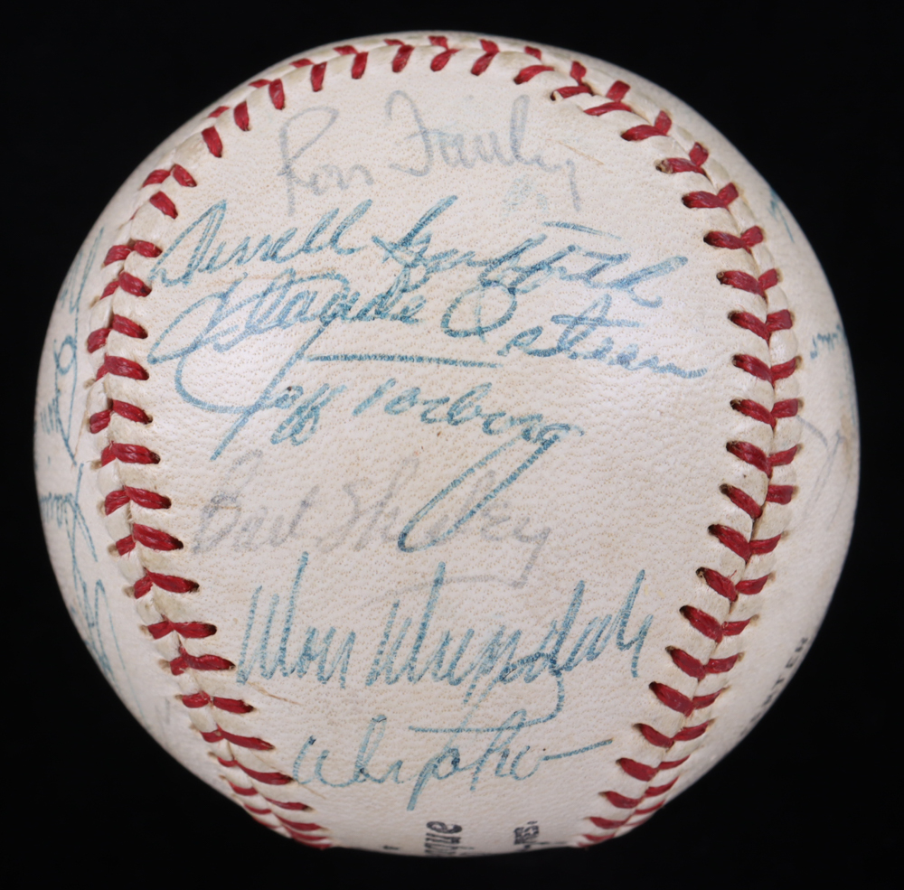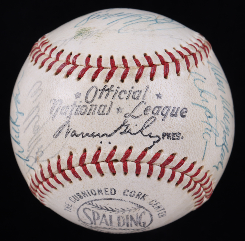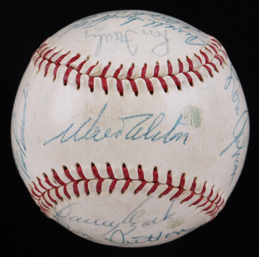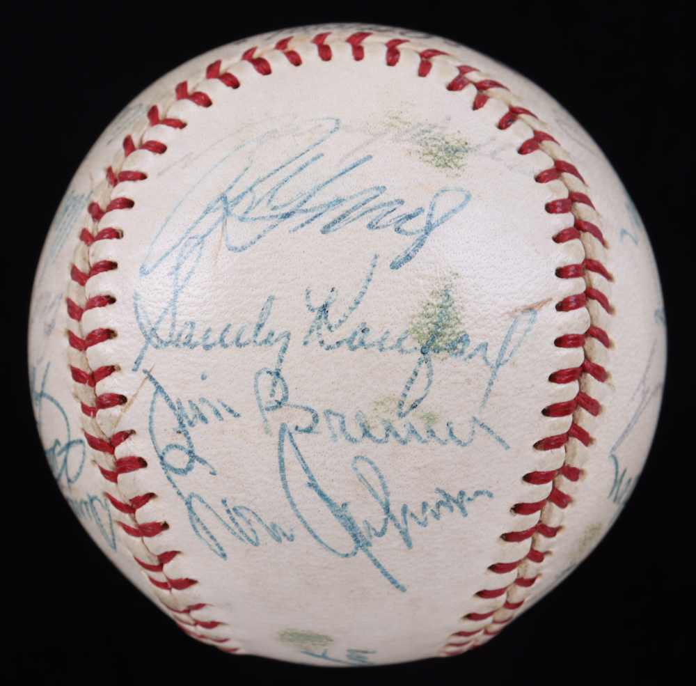 Spalding Official National League baseball has been hand-signed by (23) 1966 Los Angeles Dodgers players with Walter Alston, Don Sutton, Don Drysdale, Sandy Koufax, Danny Ozark, John Kennedy, Johnny Roseboro, Willie Davis, Joe Moeller, Ron Fairly, Derrell Griffith, Claude Osteen, Jeff Torborg, Bart Shirley, Wes Parker, Lou Johnson, Preston Gómez, Jim Brewer, Nate Oliver, Ron Perranoski, Jim Lefebvre, and one other. Please note, the baseball is naturally toned and some signatures are faded.