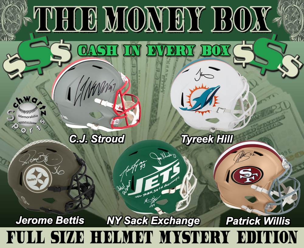 The Money Box - Full-Size Helmet Edition includes one Autographed Full-Size Replica Football Helmet in Every Box, AND as an added BONUS you will receive one Bill of United States Currency ($1, $2, $5, $10, $20, $50, or $100) - Bills of ALL of those Denominations are Included in this Series!!! There are over 65 different players included in The Money Box (Full Size Helmet Edition) Series 4 Mystery Box, which is a Pristine Exclusive edition that is limited to 150 boxes.