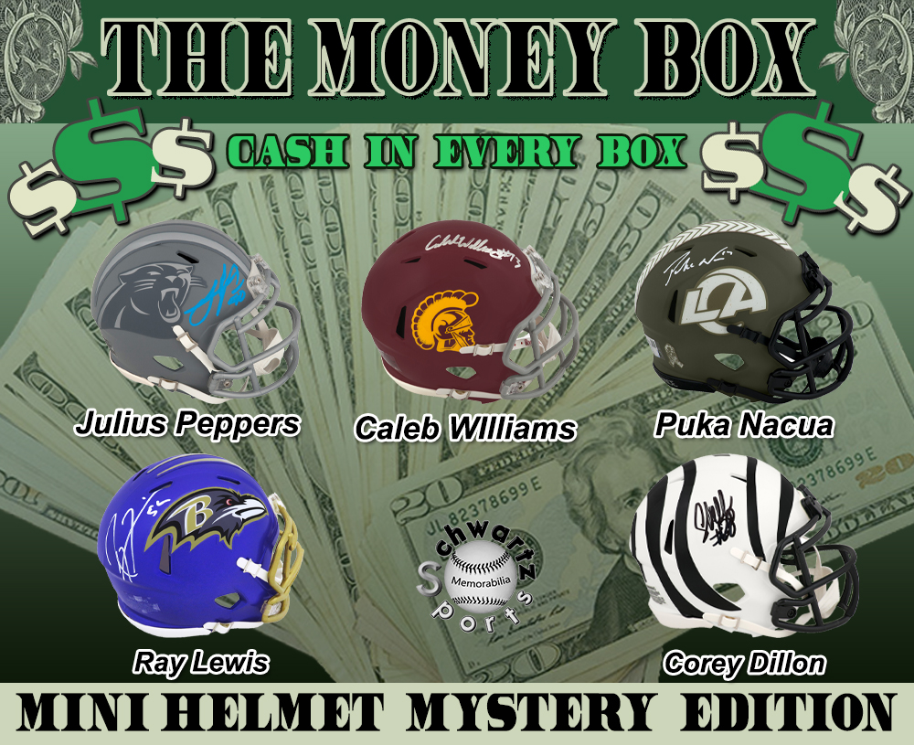 **CASH MONEY IN EVERY BOX!!!! One (1) Bill of U.S. Currency ($1, $2, $5, $10, $20, $50, or $100) IN EVERY BOX!! ** (Currency is securely located inside the autographed mini helmet)