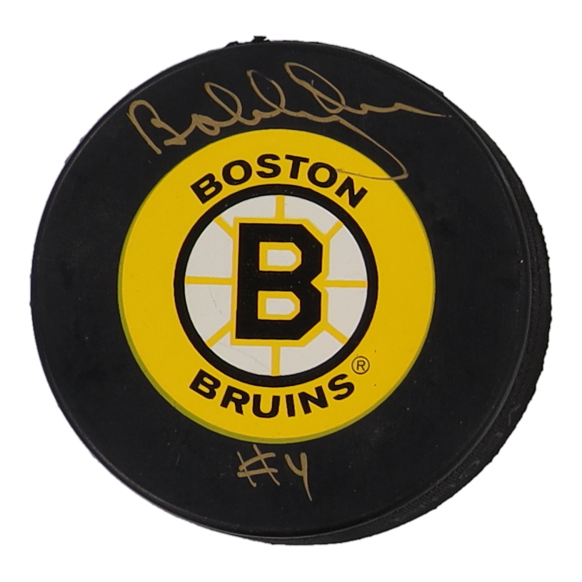 Boston Bruins logo hockey puck. Hand-signed by Bobby Orr (HOF).
