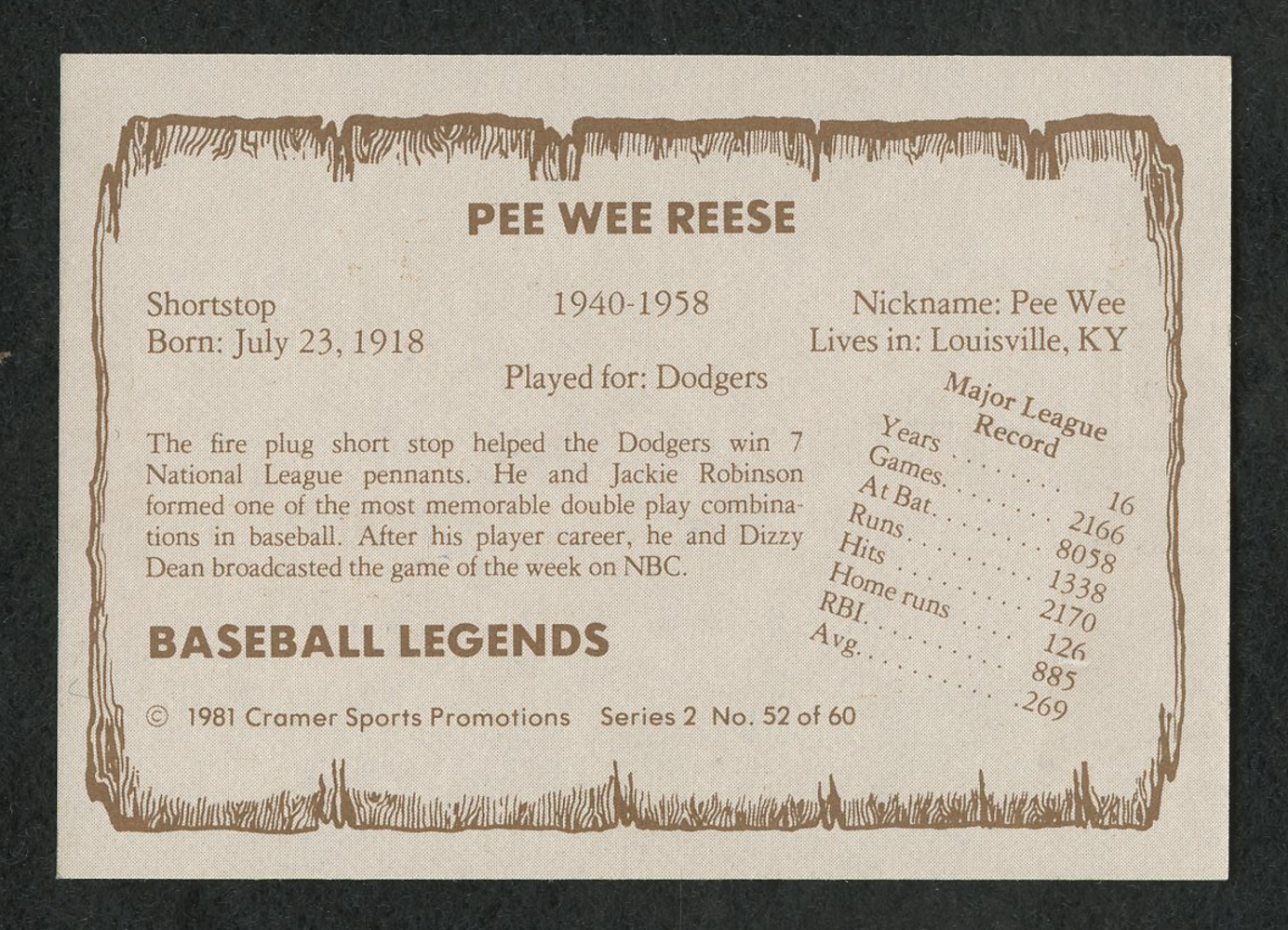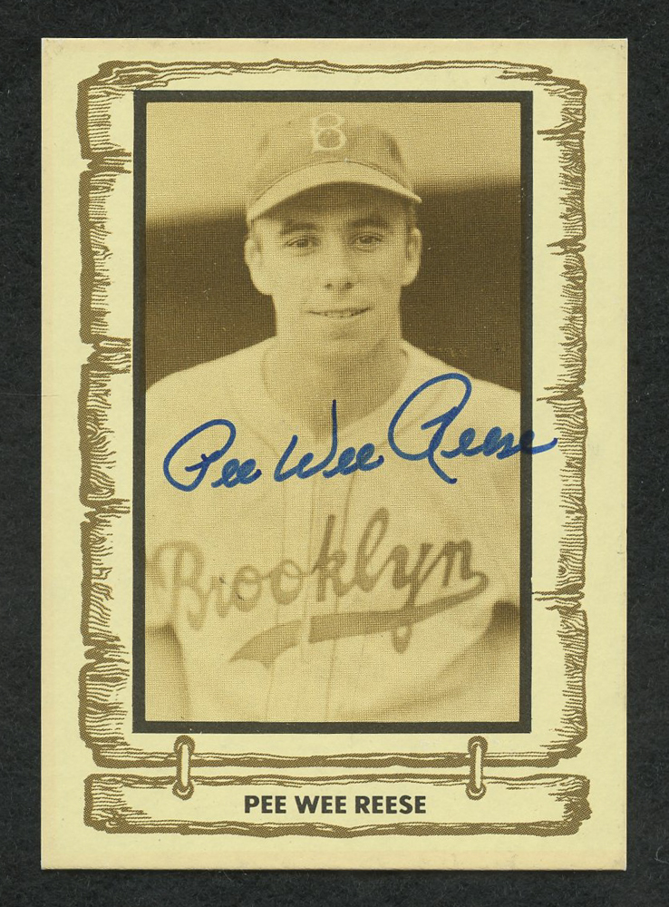 1981 Cramer Sports Promotions #52 baseball card has been hand-signed in blue felt-tip pen by Pee Wee Reese (D. 1999, Dodgers, HOF).
