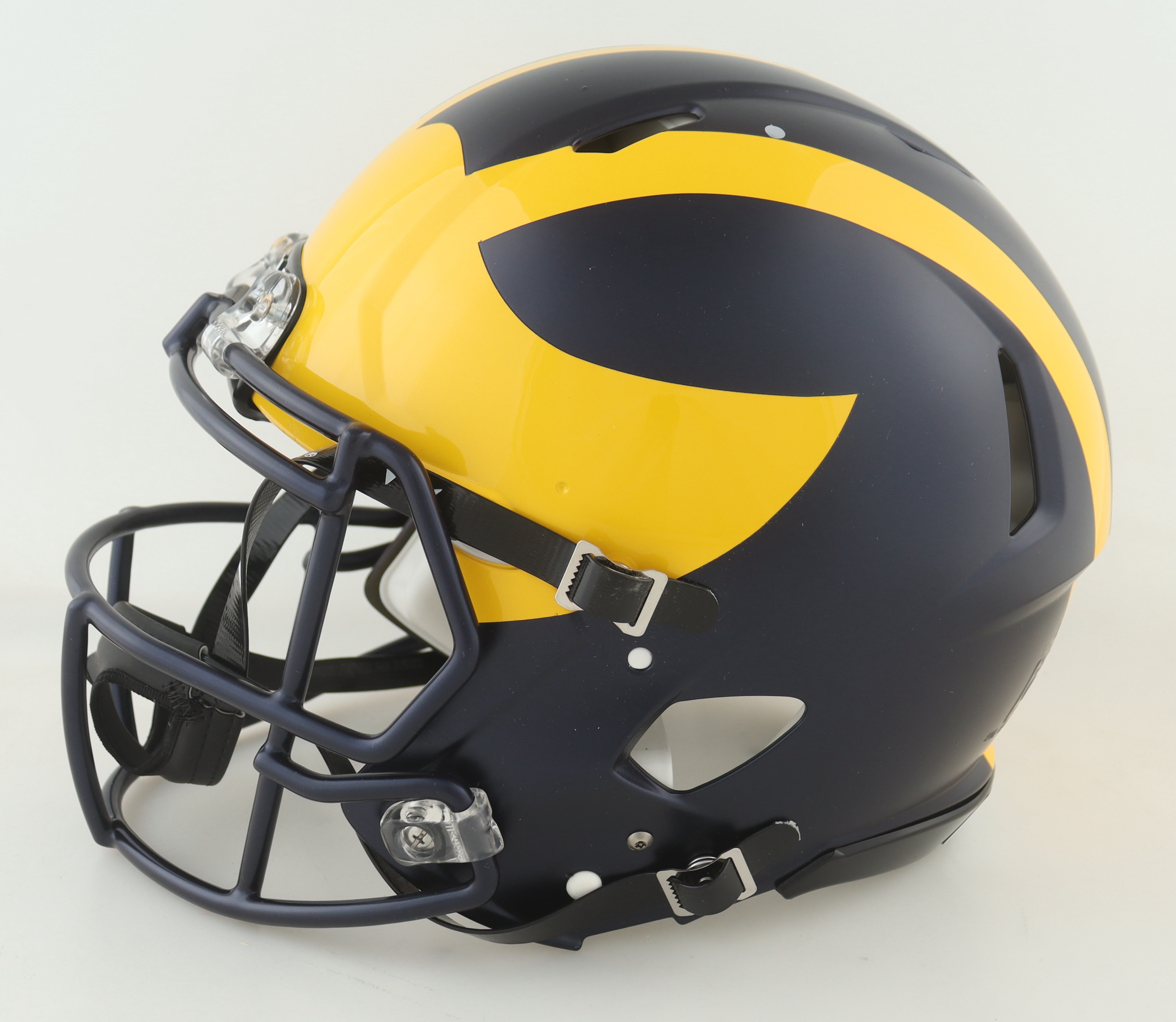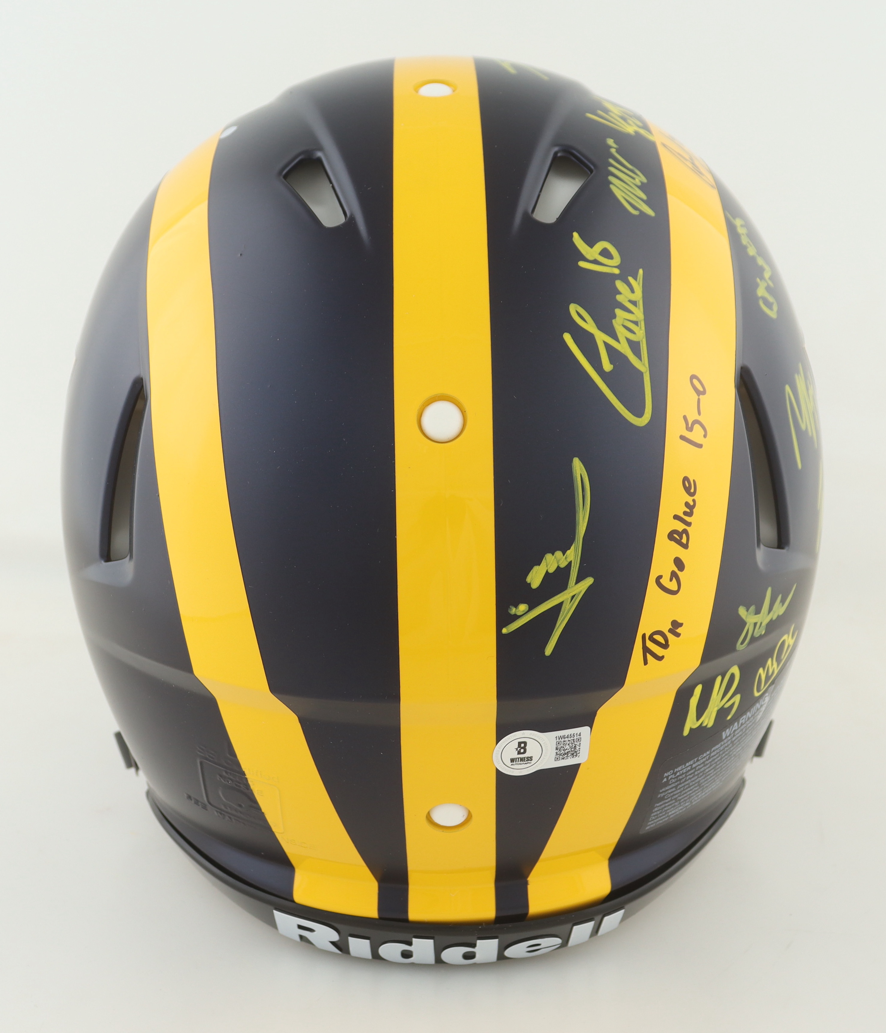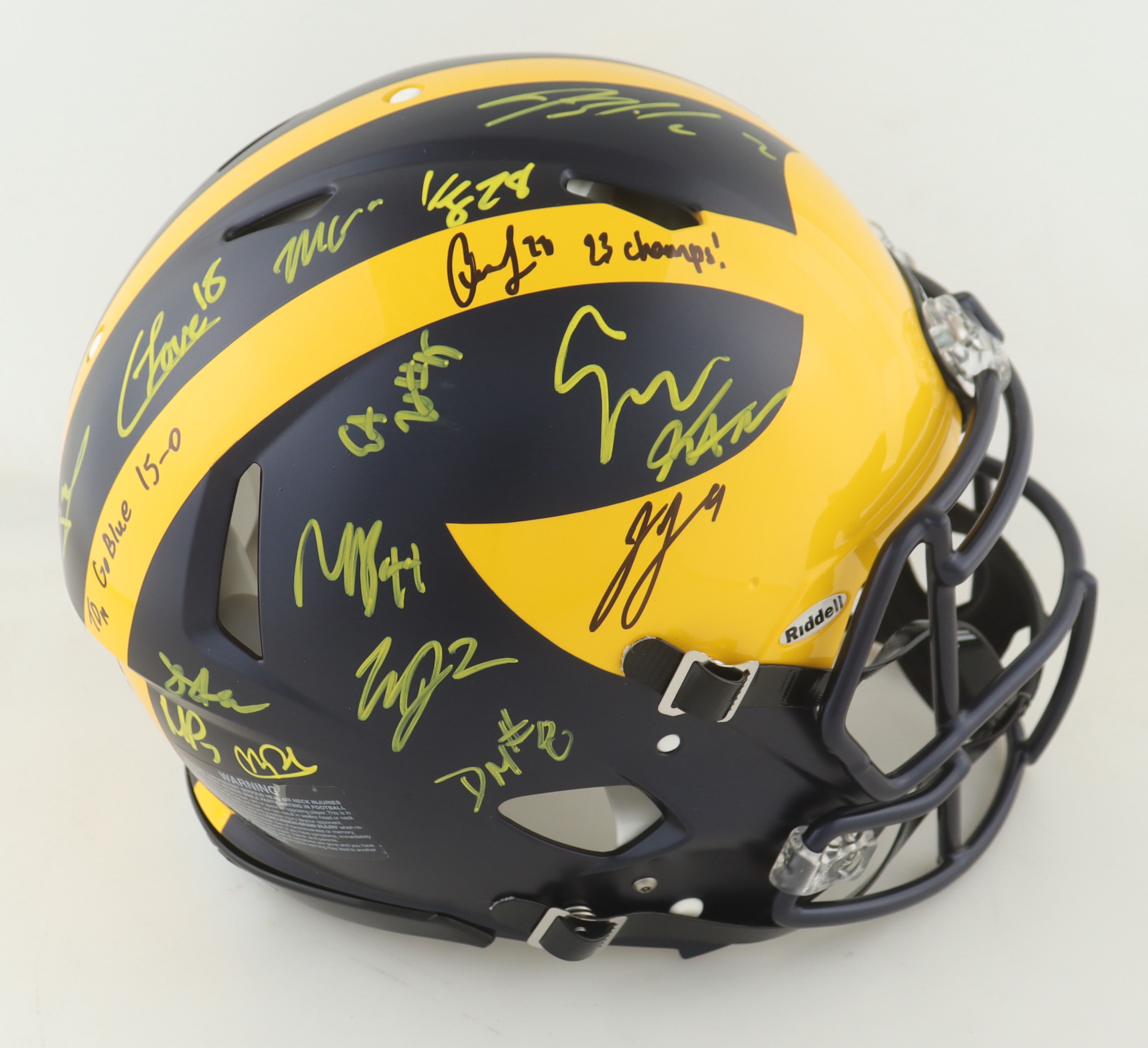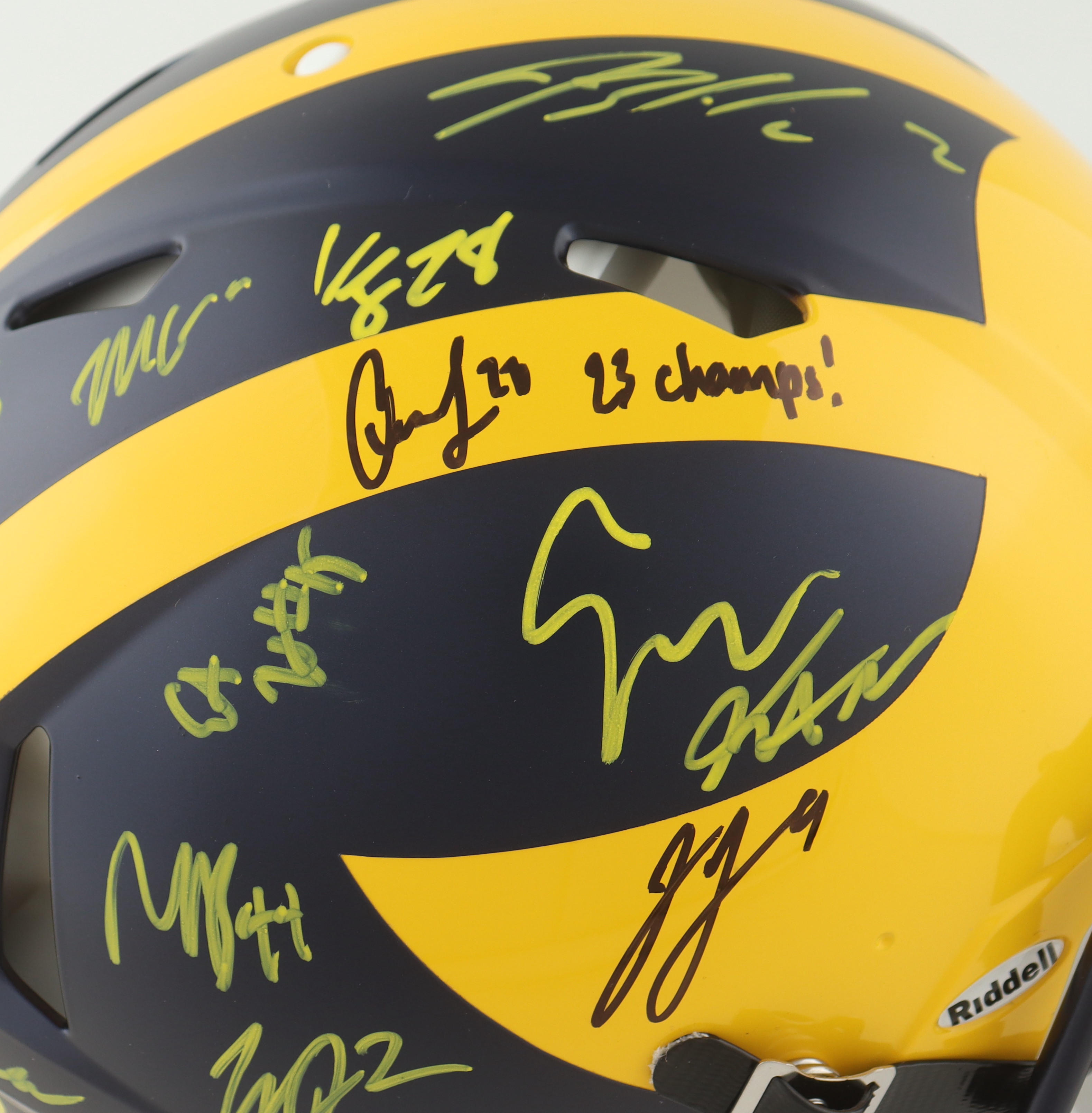 Riddell Michigan Wolverines full-size Authentic On-Field Speed helmet. Hand-signed and inscribed by (17) members of the 2023 Michigan Wolverines National Championship team. Signers include J.J. McCarthy, Max Bredeson, Mike Sainristil, Colston Loveland, Will Johnson, Mason Graham, Derrick Moore, Semaj Morgan, Makari Paige, Myles Hinton, Kalel Mullings, Kenneth Grant, Josiah Stewart, Ernest Huusmann, Blake Corum, Quentin Johnson and Tommy Doman.