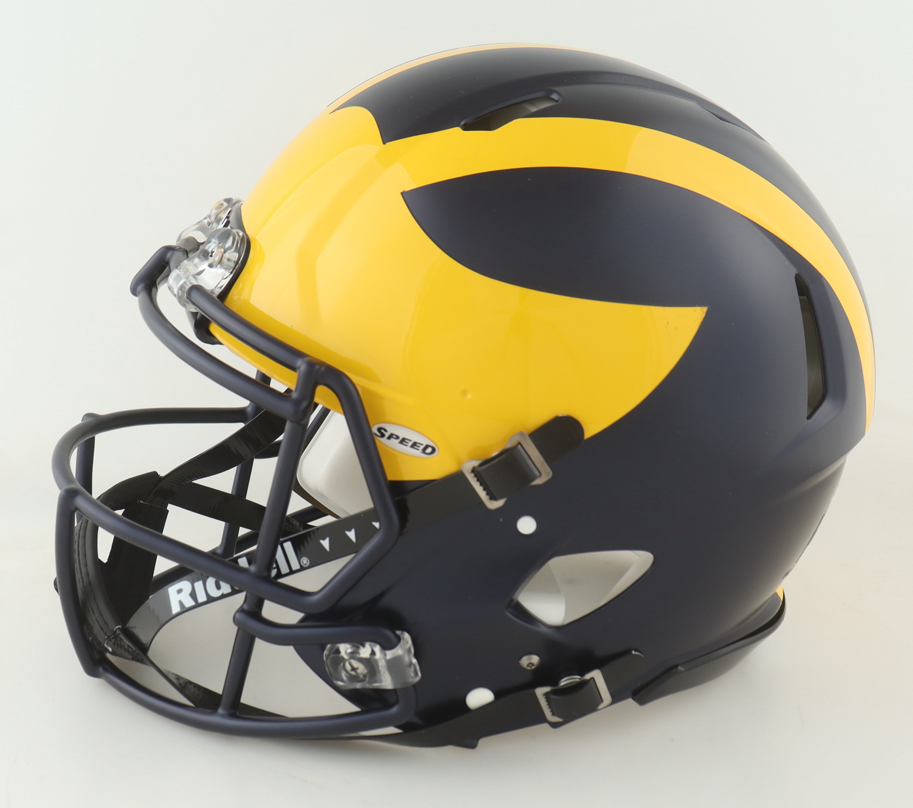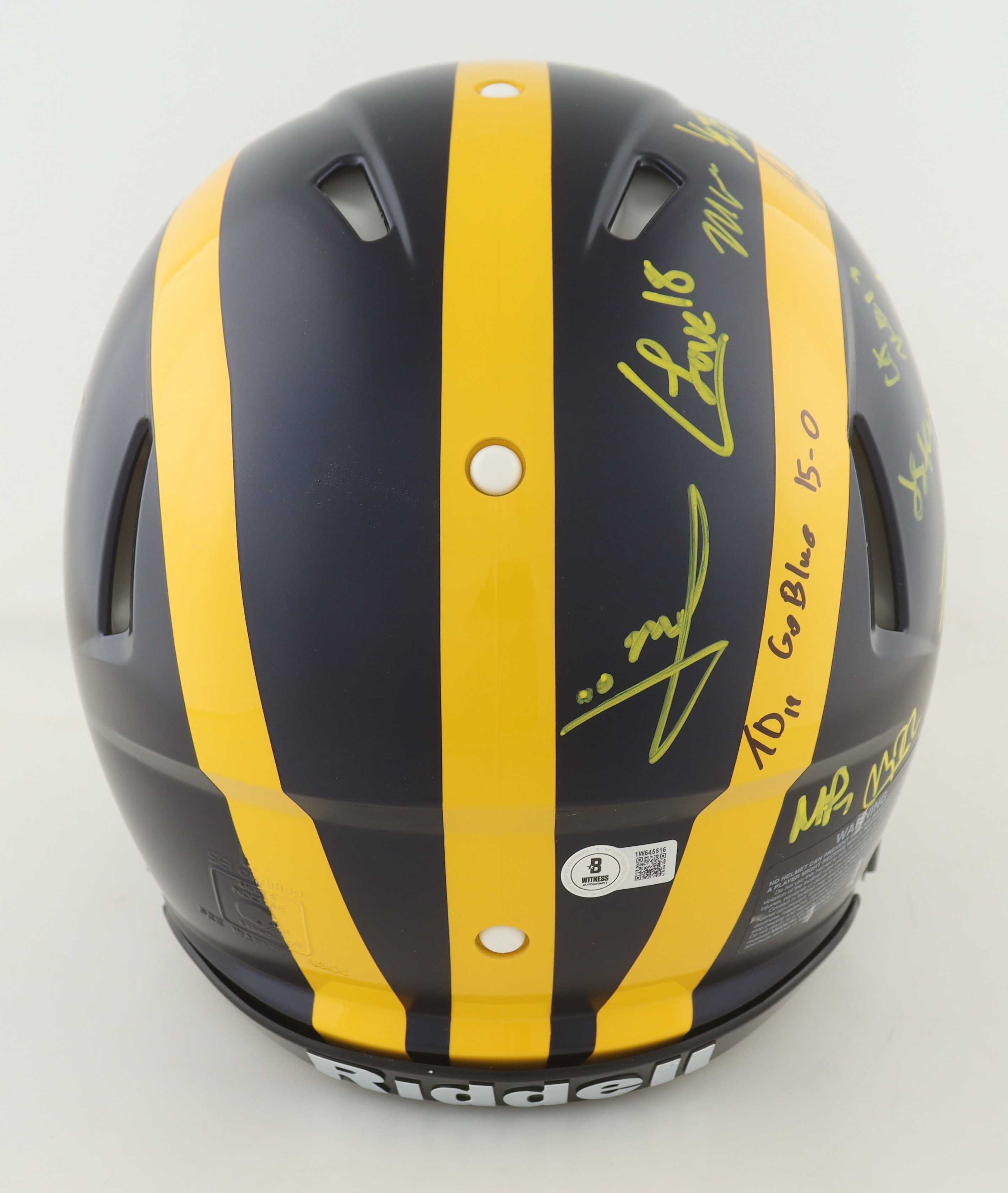 Riddell Michigan Wolverines full-size Authentic On-Field Speed helmet. Hand-signed and inscribed by (17) members of the 2023 Michigan Wolverines National Championship team. Signers include J.J. McCarthy, Max Bredeson, Mike Sainristil, Colston Loveland, Will Johnson, Mason Graham, Derrick Moore, Semaj Morgan, Makari Paige, Myles Hinton, Kalel Mullings, Kenneth Grant, Josiah Stewart, Ernest Huusmann, Blake Corum, Quentin Johnson and Tommy Doman.