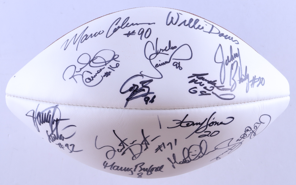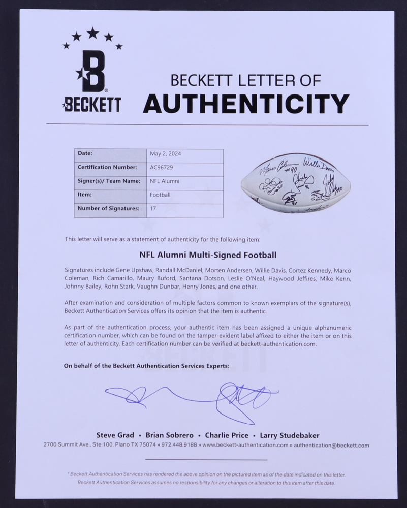 Wilson NFL Football has been hand-signed and inscribed by (17) members of the NFL Alumni with Gene Upshaw, Randall McDaniel, Morten Andersen, Willie Davis, Cortez Kennedy, Marco Coleman, Rich Camarillo, Maury Buford, Santana Dotson, Leslie O'Neal, Haywood Jeffires, Mike Kenn, Johnny Bailey, Rohn Stark, Vaughn Dunbar, Henry Jones, and one other.