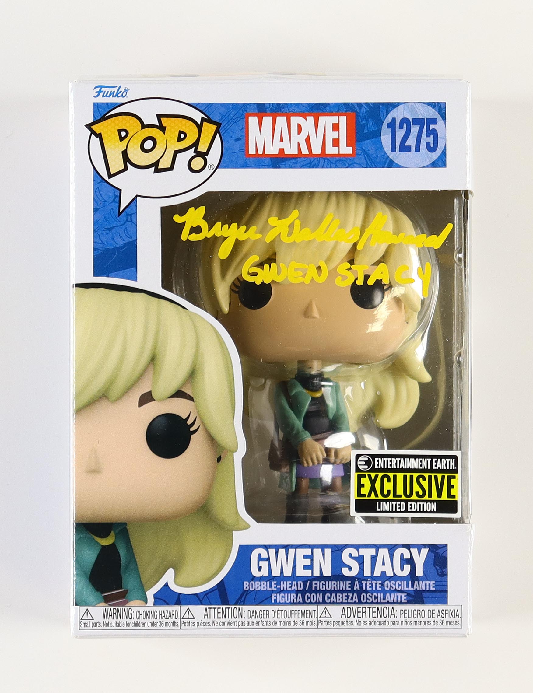Funko Pop! figure measures approximately 4" tall. Hand-signed and inscribed on the packaging by Bryce Dallas Howard (Gwen Stacy).