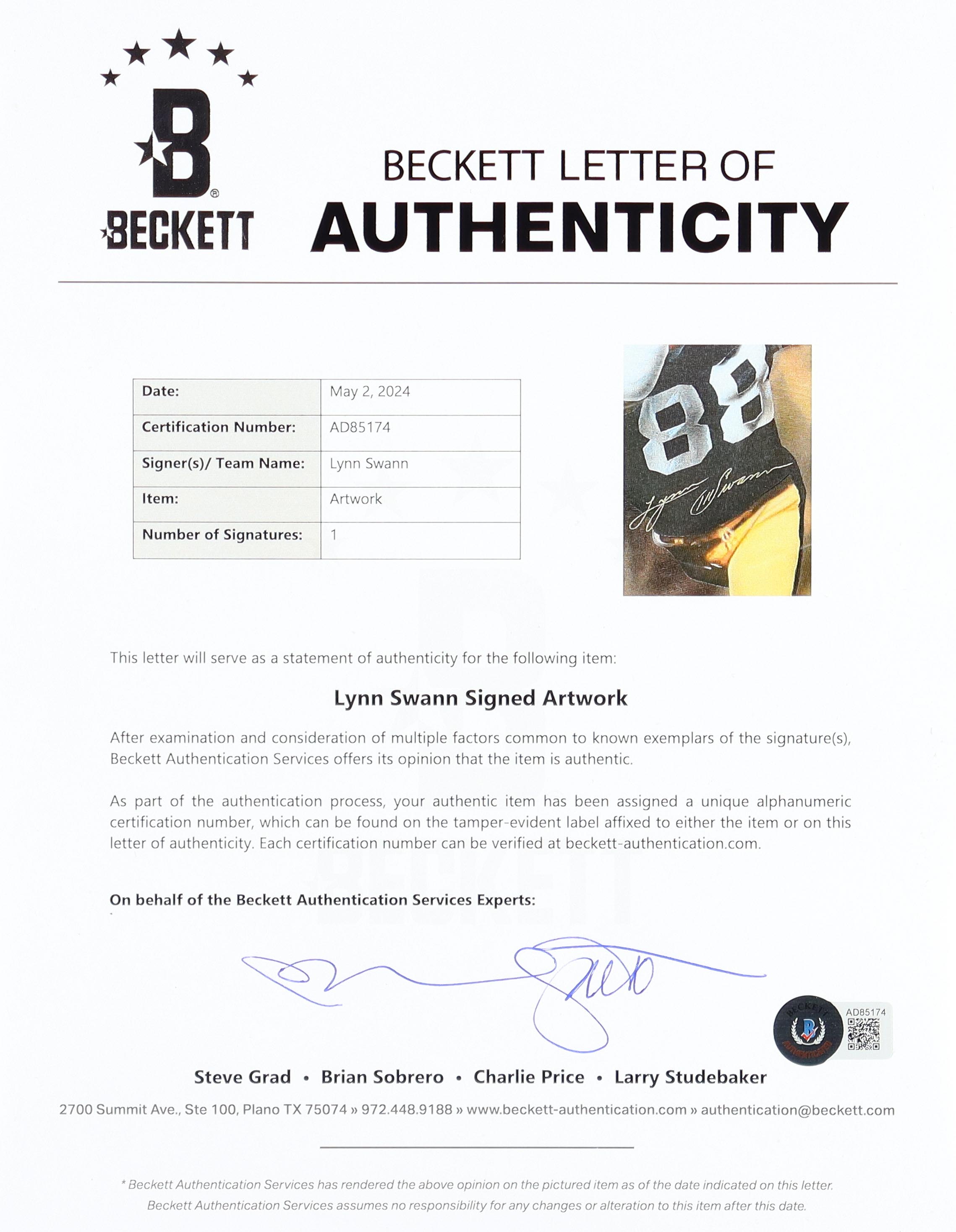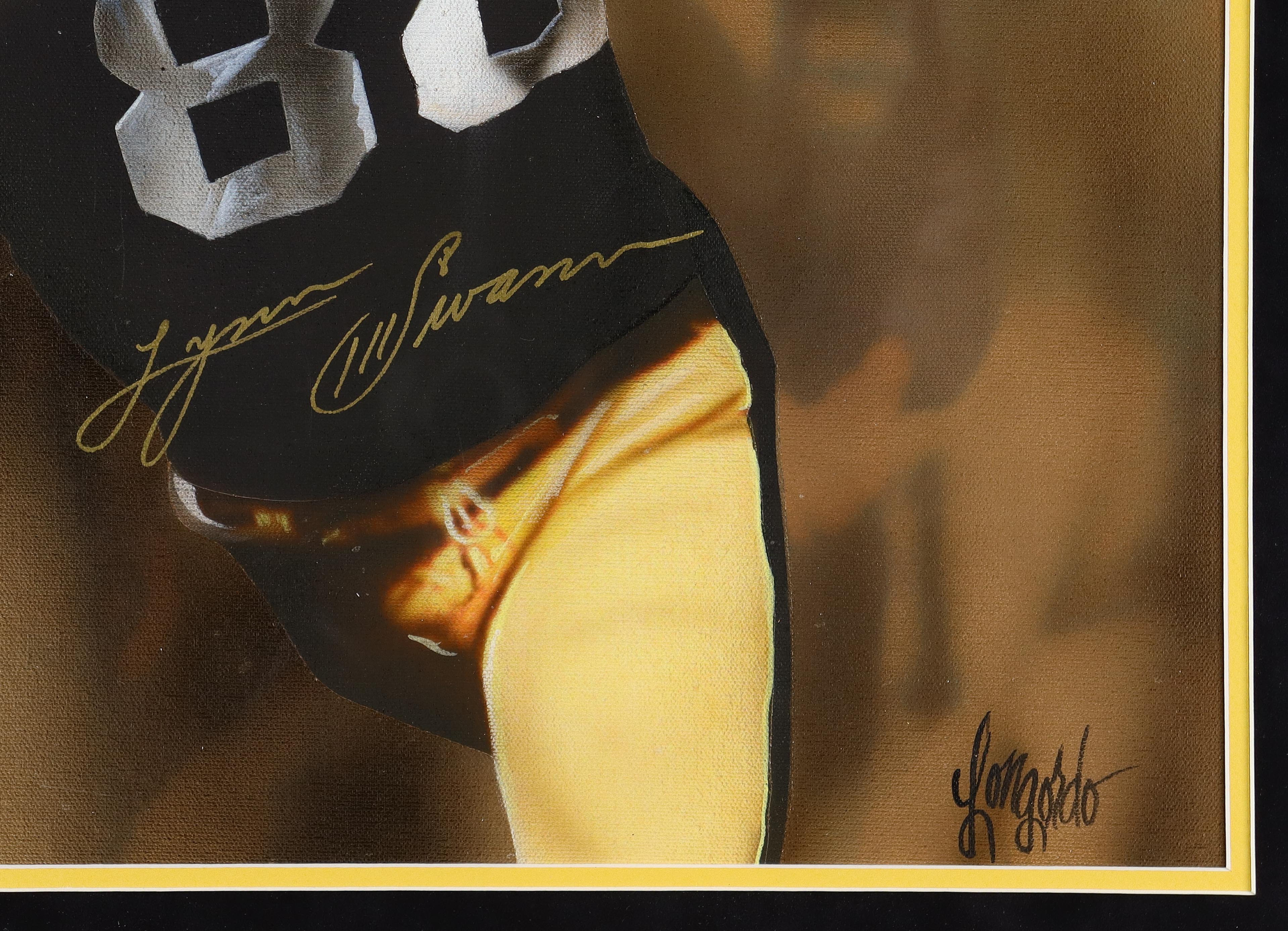 Custom frame measures 27.5" x 35.5" in size and features an original artwork that has been hand-signed by Lynn Swann (Pittsburgh Steelers, HOF), as well as the artist, Gary Longordo.