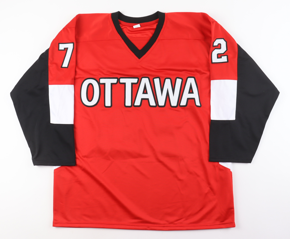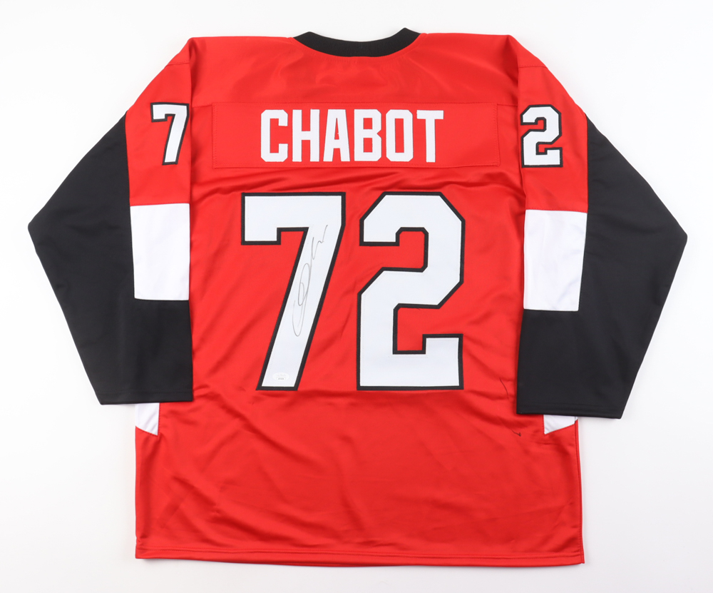 Custom jersey with everything sewn on, size XL. Has been hand-signed by Thomas Chabot. Please note, there are stray ink marks to the right of the reverse number.