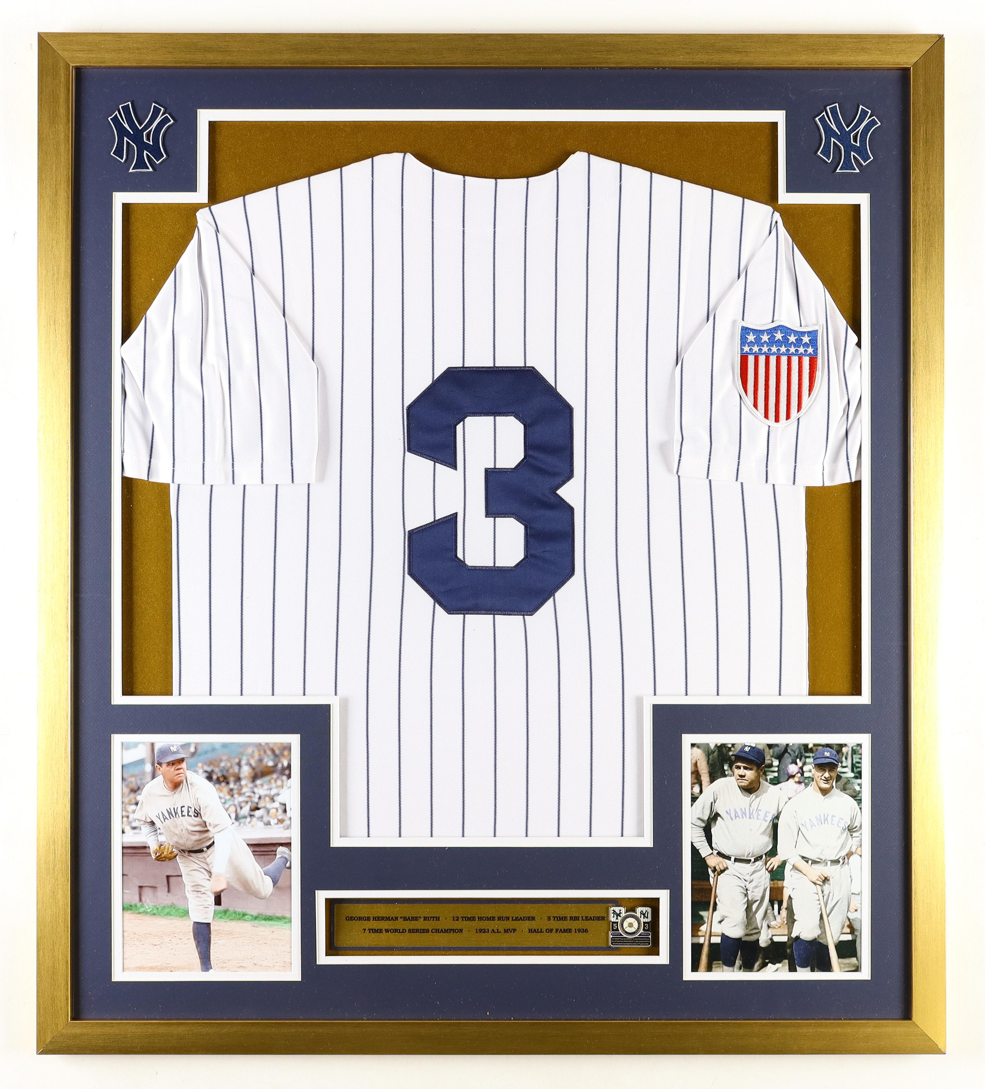 Custom frame measures approximately 32" x 36" in size. Display features includes an unsigned Babe Ruth (D. 1948, New York Yankees, HOF) jersey, an official 1921 World Series pin and (2) Yankees logo cloth patches. Please note, the display is unsigned and the frame has corner wear and scuffing on the borders.