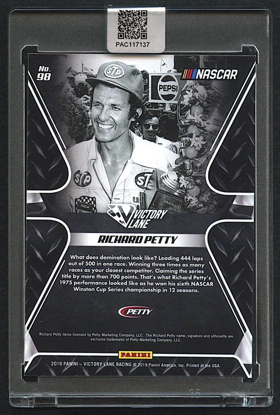 Richard Petty Signed 2019 Panini Victory Lane Pedal to the Metal #98 (PA Encapsulated)