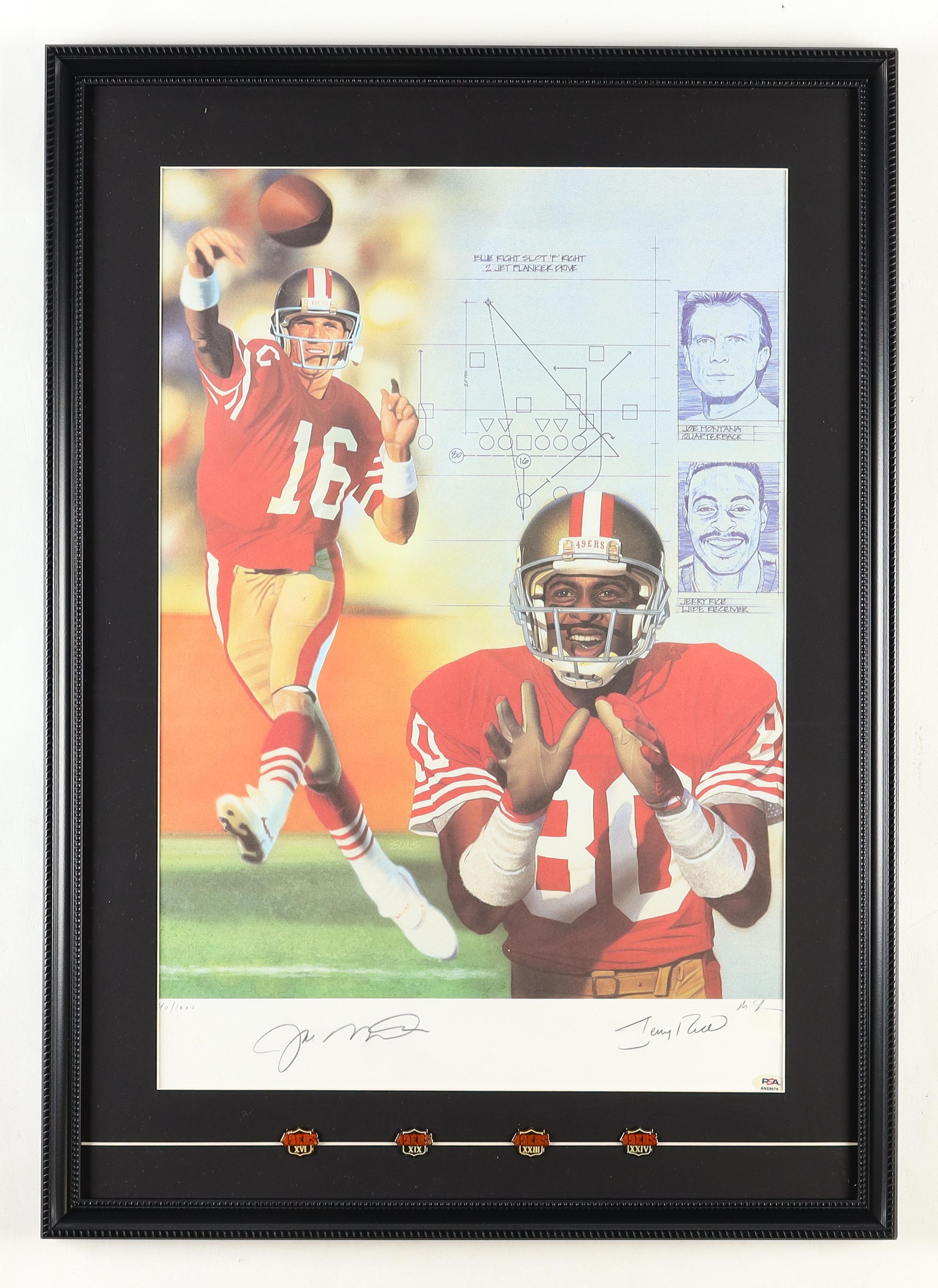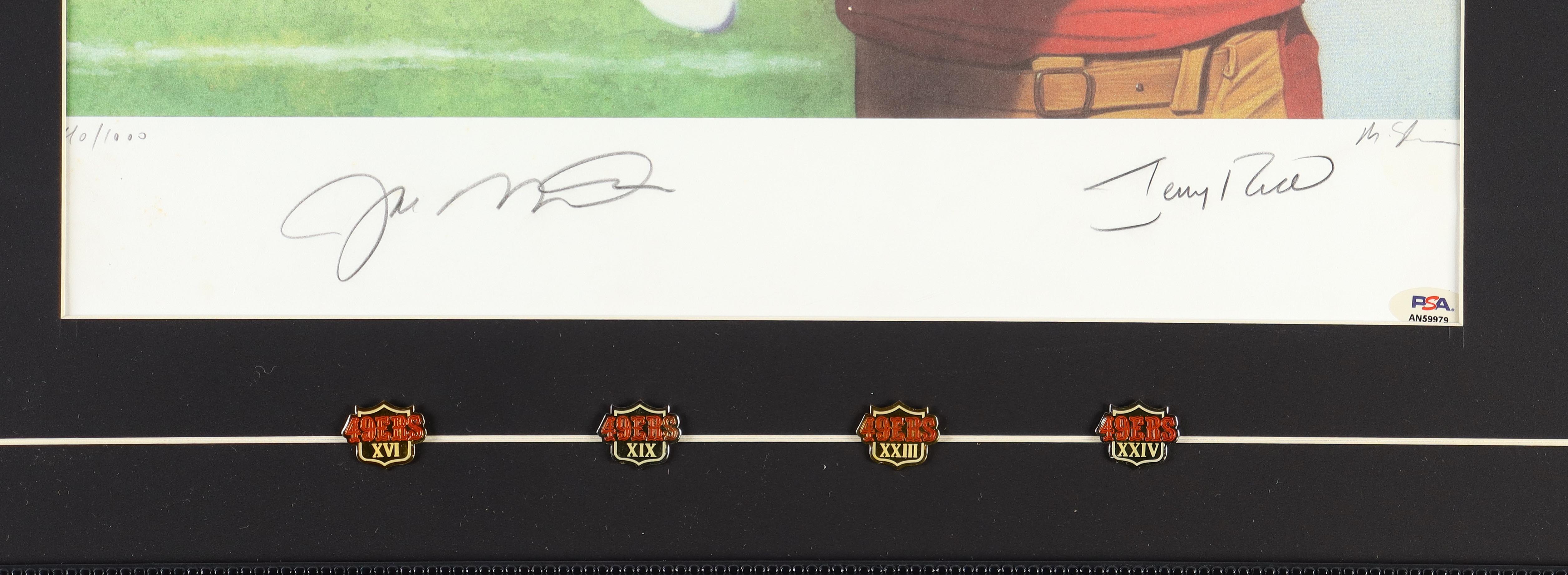 Custom Frame Art Print measures 23" x 32" in size and has been hand-signed by Joe Montana (San Francisco 49ers, HOF) and Jerry Rice (San Francisco 49ers, HOF). It comes with a full set of 49ers Super Bowl XVI, XIX, XXIII, and XXIV Pins. Refer to photo for condition of the display.