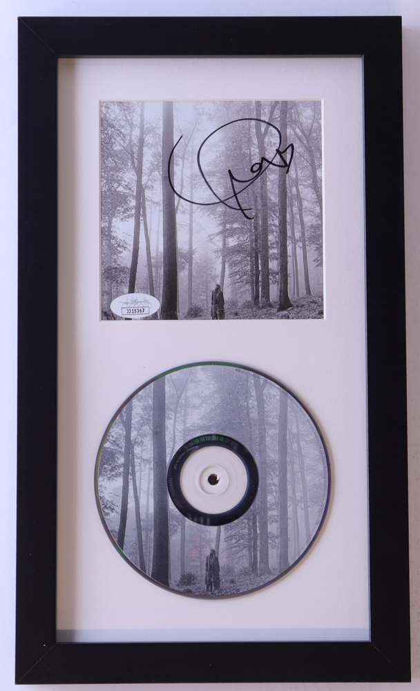Custom frame measures approximately 8" x 13.5" in size. Features a "Folklore" CD album cover that has been hand-signed by Taylor Swift. The CD disc is included as shown.