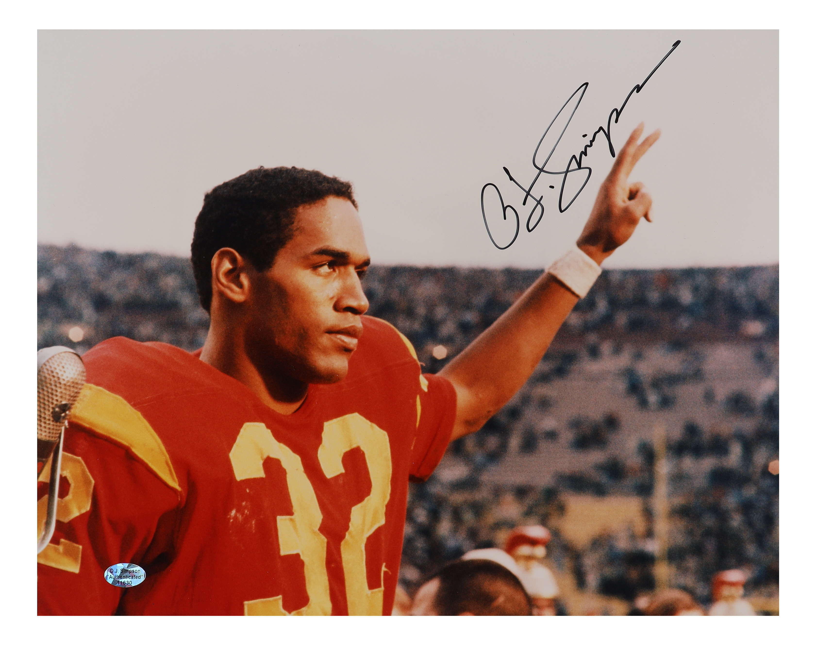 Photo measures 11" x 14" in size. Hand-signed by O.J. Simpson (D. 2024, USC Trojans, HOF).
