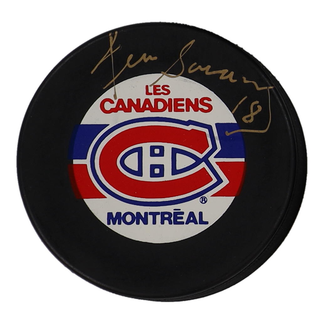 Montreal Canadians logo hockey puck has been hand-signed Denis Savard (HOF).