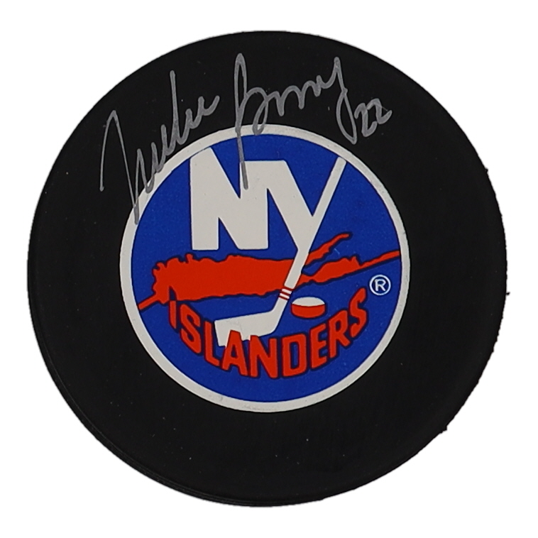 New York Islanders Logo hockey puck has been hand-signed by Mike Bossy (D. 2022, HOF).
