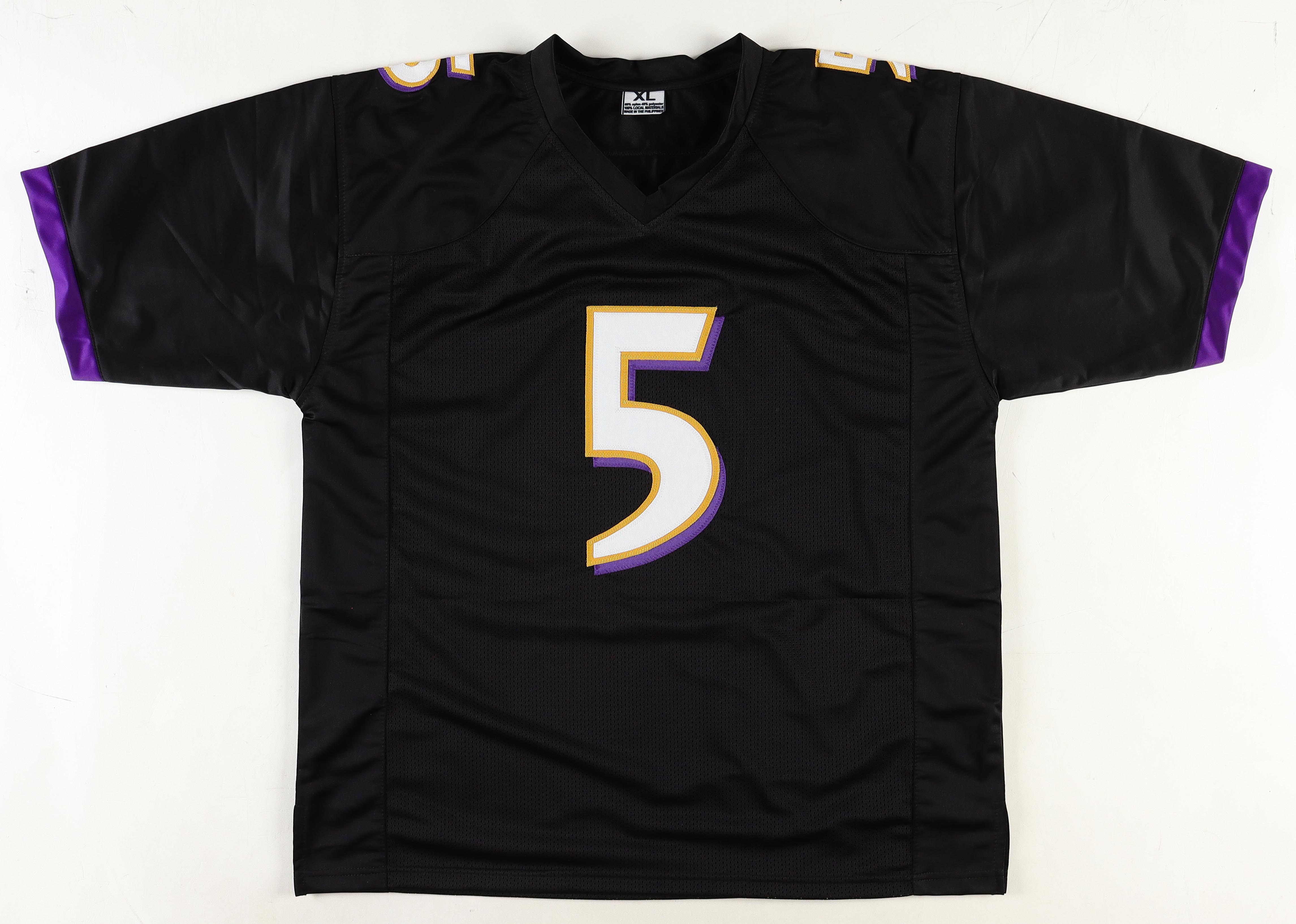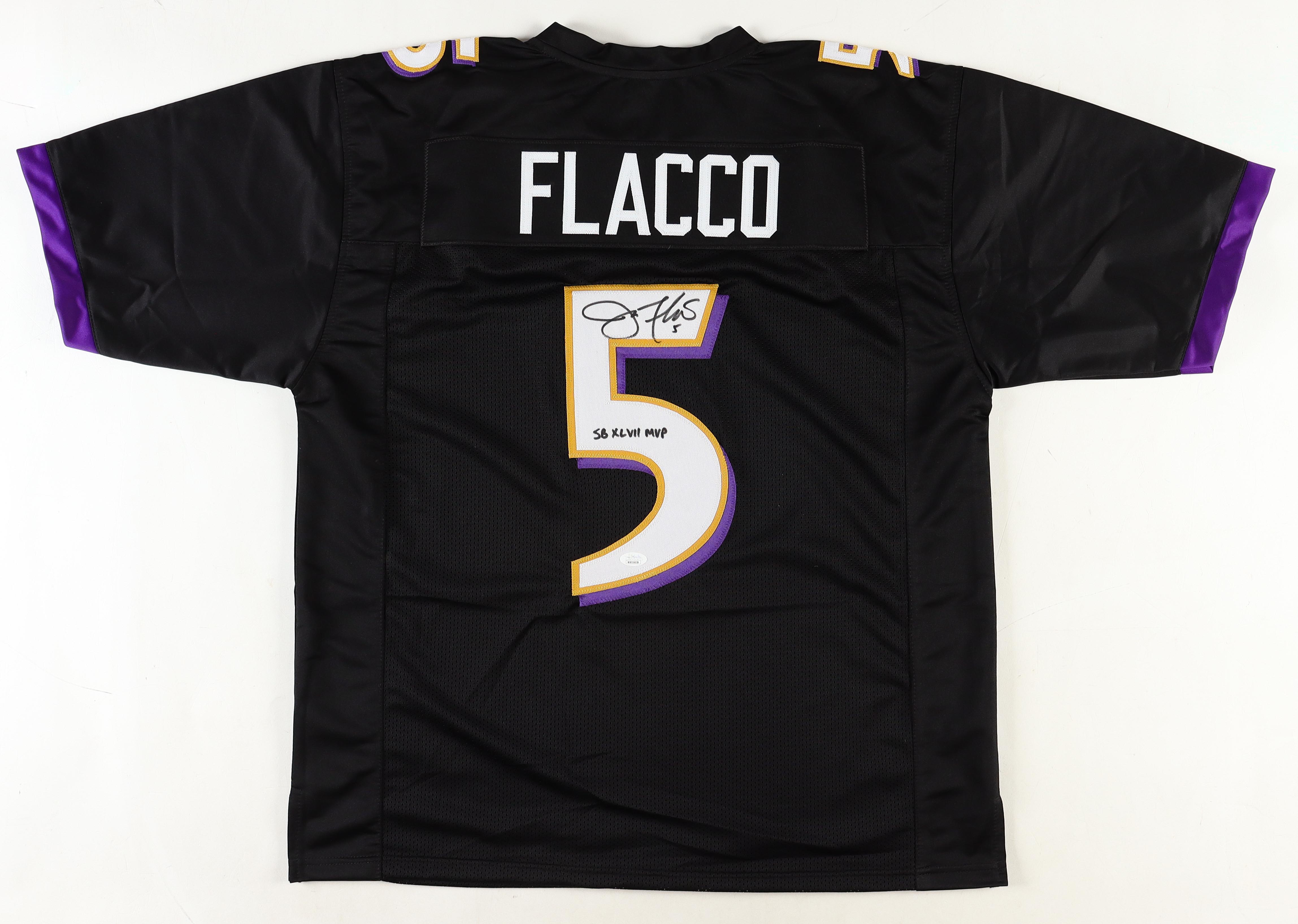 Custom jersey with everything sewn on, size XL. Hand-signed and inscribed by Joe Flacco.