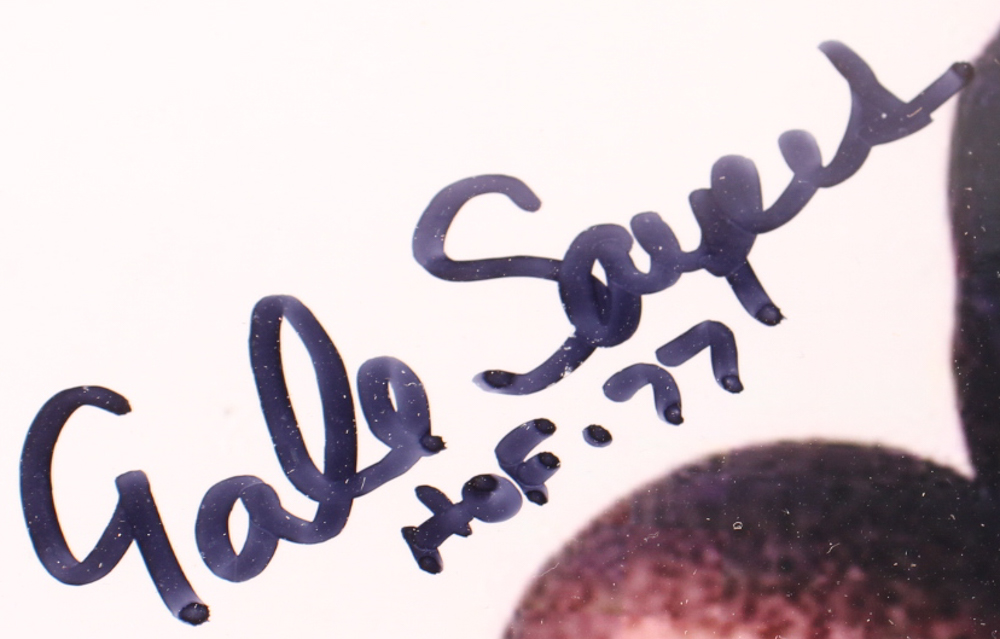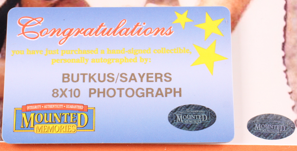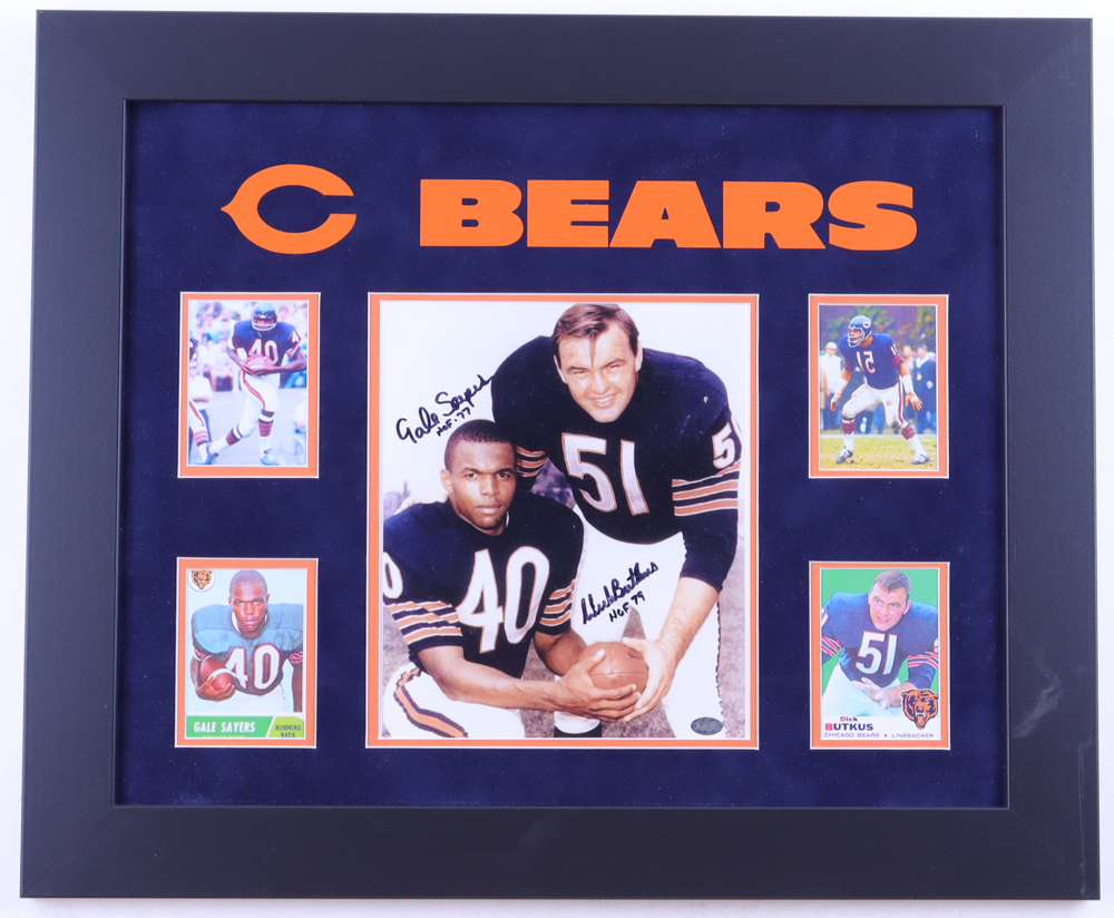 Custom frame measures approximately 19.5" x 23.5" in size and features a photo that has been hand-signed and inscribed by Gale Sayers (D. 2020, Chicago Bears, HOF) and Dick Butkus (D. 2023, Chicago Bears, HOF). Please note, there is some scuffing on the frame.