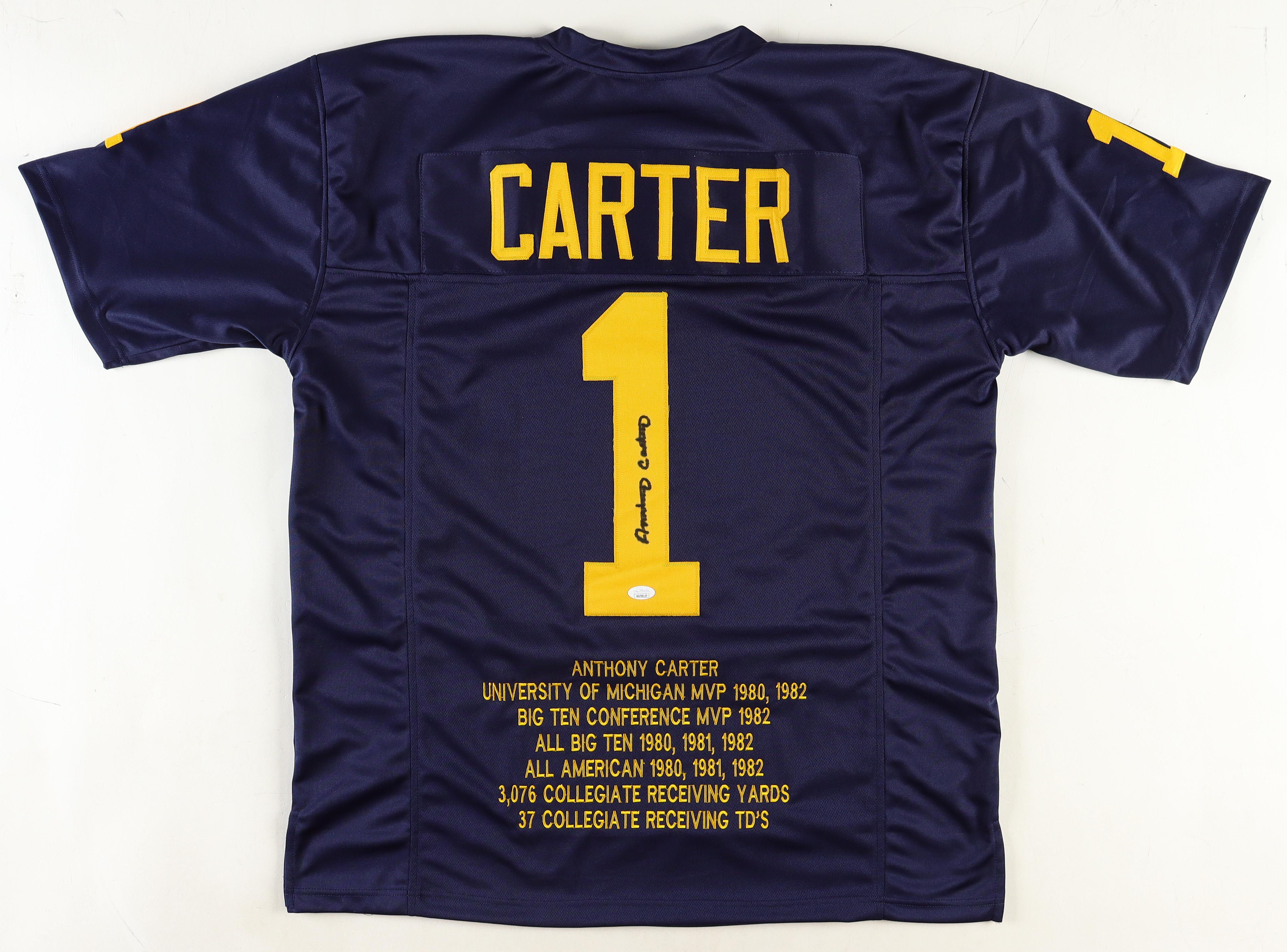 Custom jersey. Everything is sewn on, size XL. Hand-signed by Anthony Carter. Please. note, the signature has bled. Carter's career highlight stats are custom stitched below the reverse number.