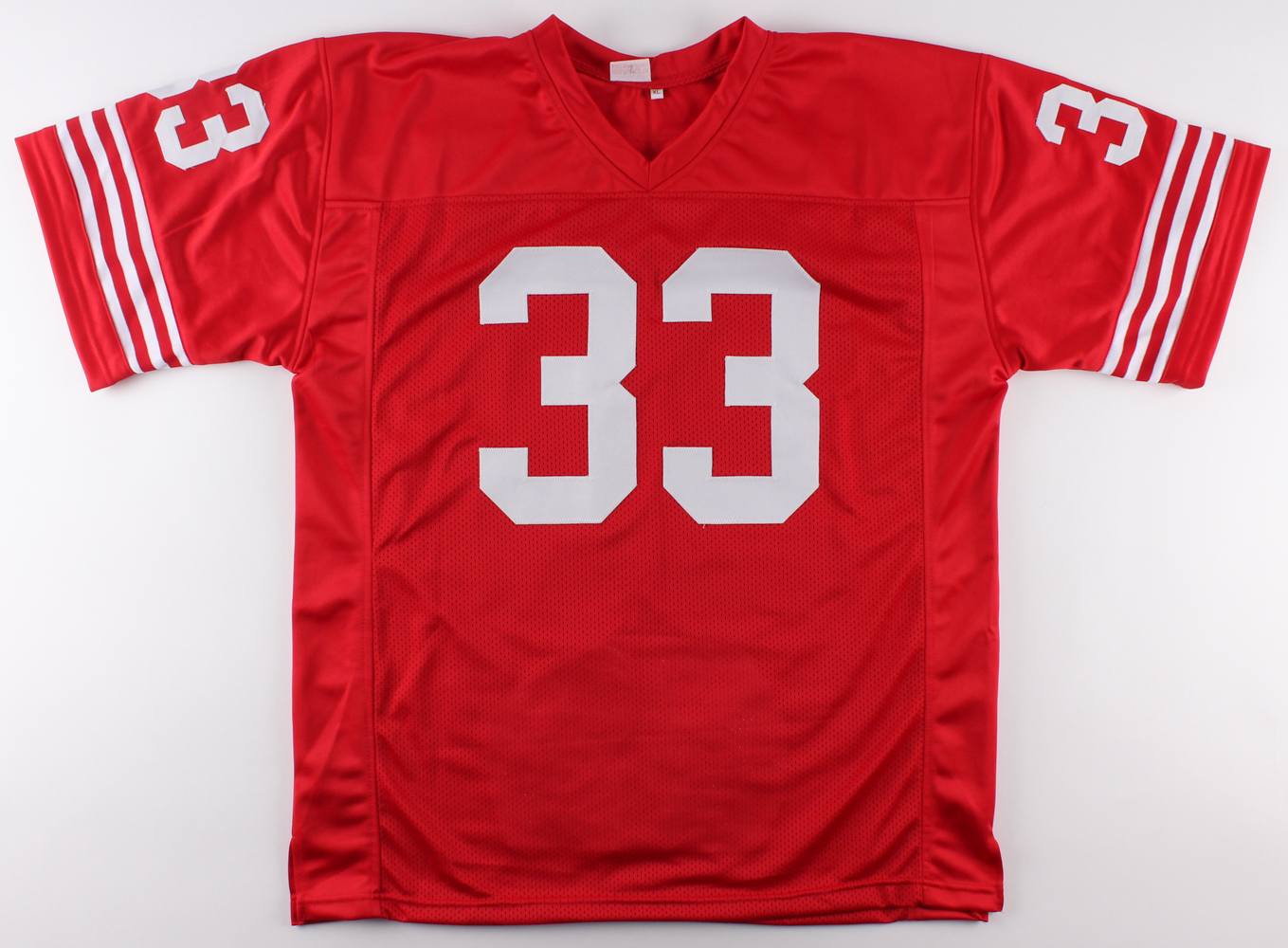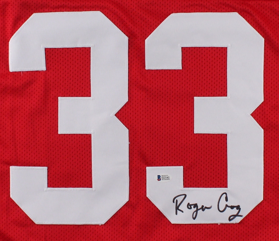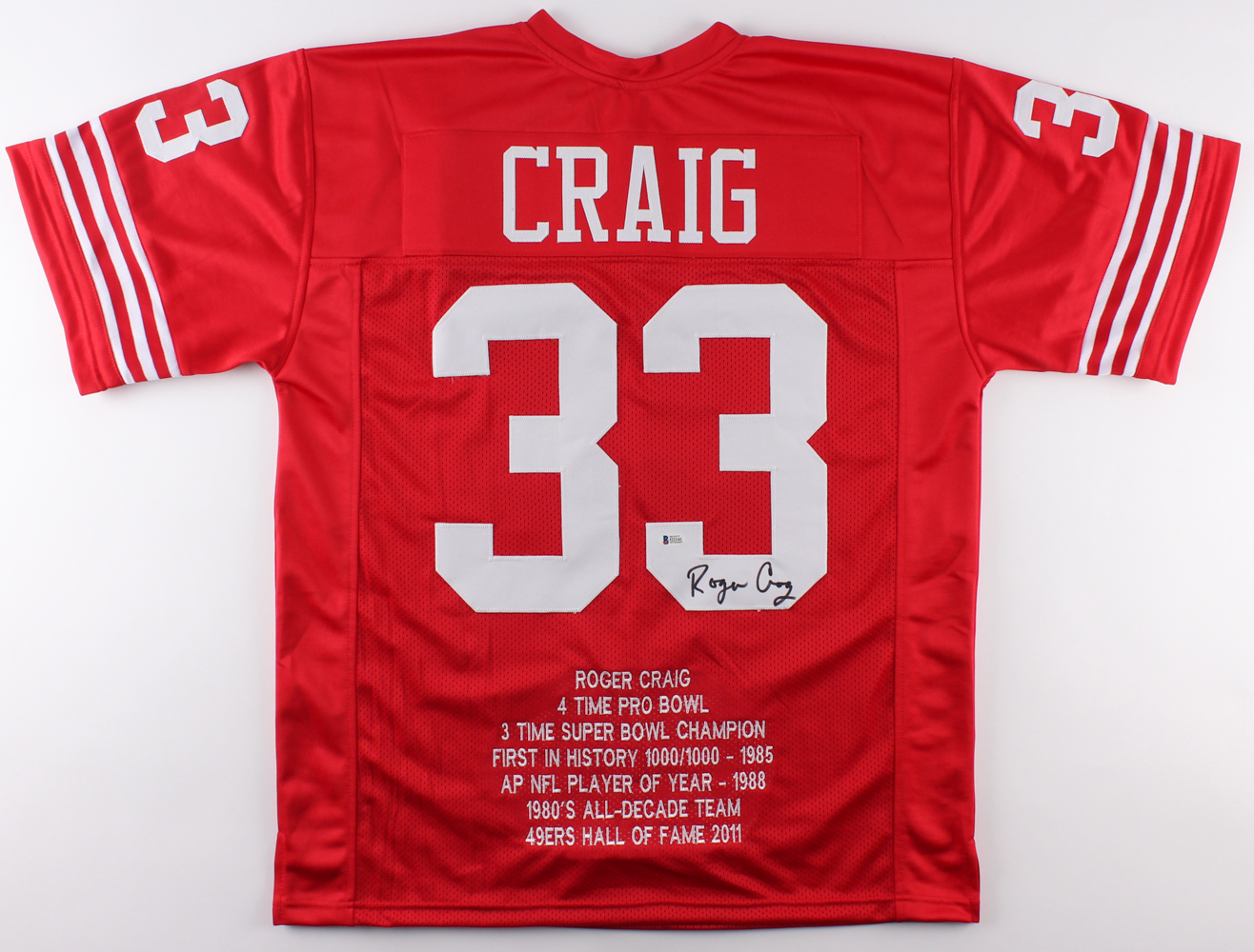 Custom on-field style jersey. Everything is sewn on, size XL. Hand-signed in black felt tip pen by Roger Craig (49ers, Raiders). Craig's career highlights are custom stitched below the numbers on the reverse side of the jersey.