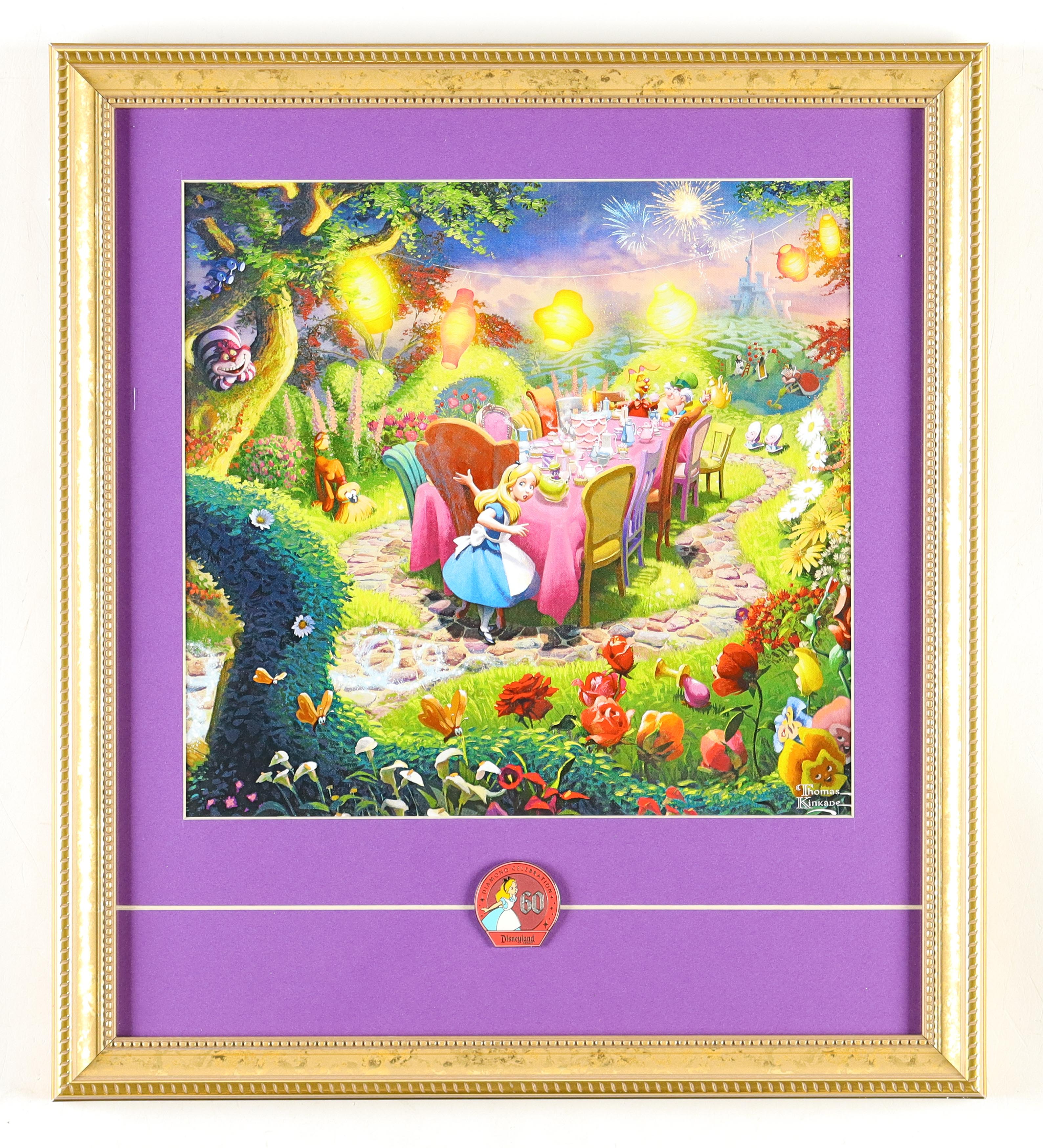 Custom frame measures approximately 16" x 18" in size. Features a Thomas Kinkade "Alice In Wonderland" print. The display also includes an Alice 60 Years Diamond Celebration pin. Please note, the display is unsigned.