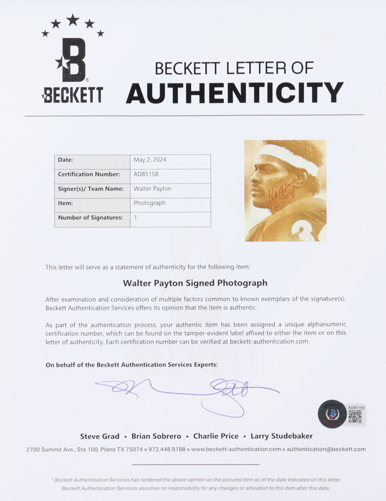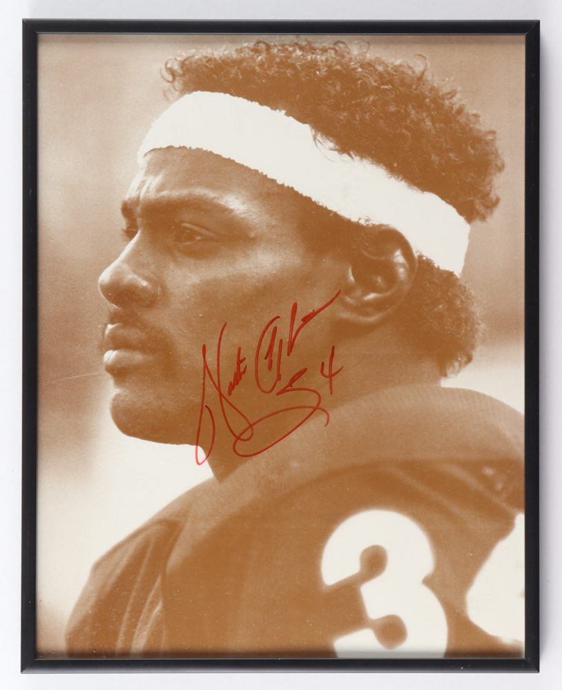 Custom frame measures 11" x 14" in size and features a photo that has been hand-signed by Walter Payton (D. 1999, Chicago Bears, HOF). Please see photos for details regarding the condition of the frame.