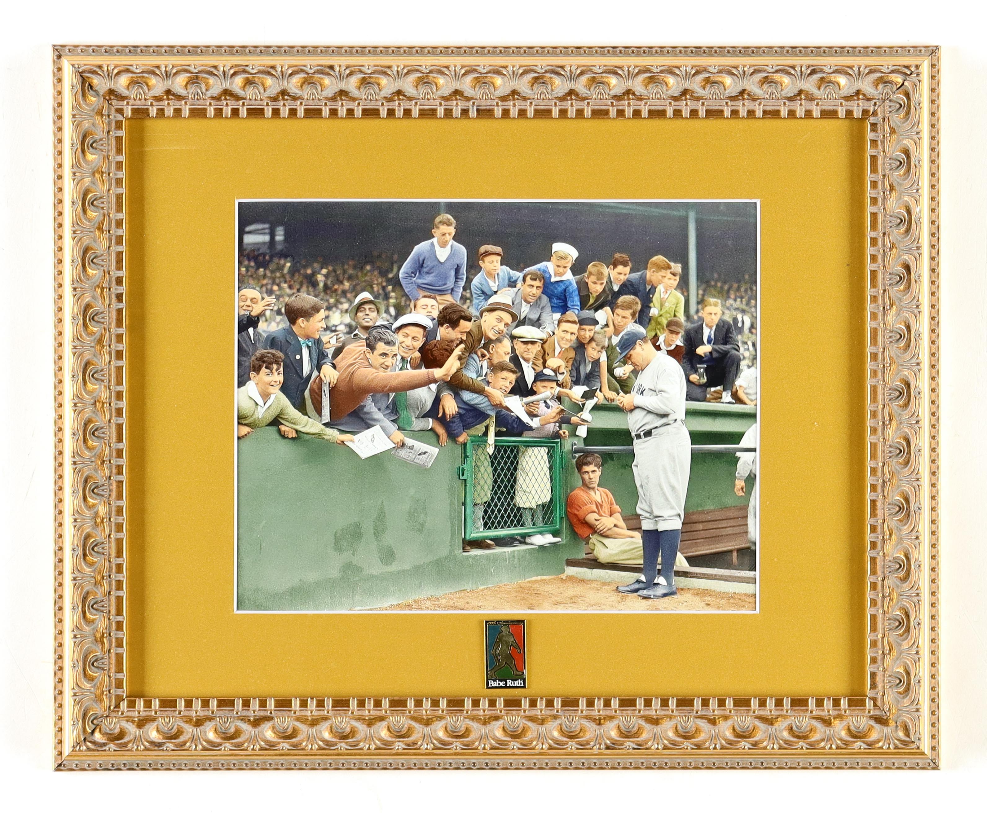 Custom frame measures approximately 13.25" x 16.25" in size and features an unsigned colorized photo of Babe Ruth (D. 1948, New York Yankees, HOF). Display includes a 100th Anniversary pin. Please note, this item is unsigned.