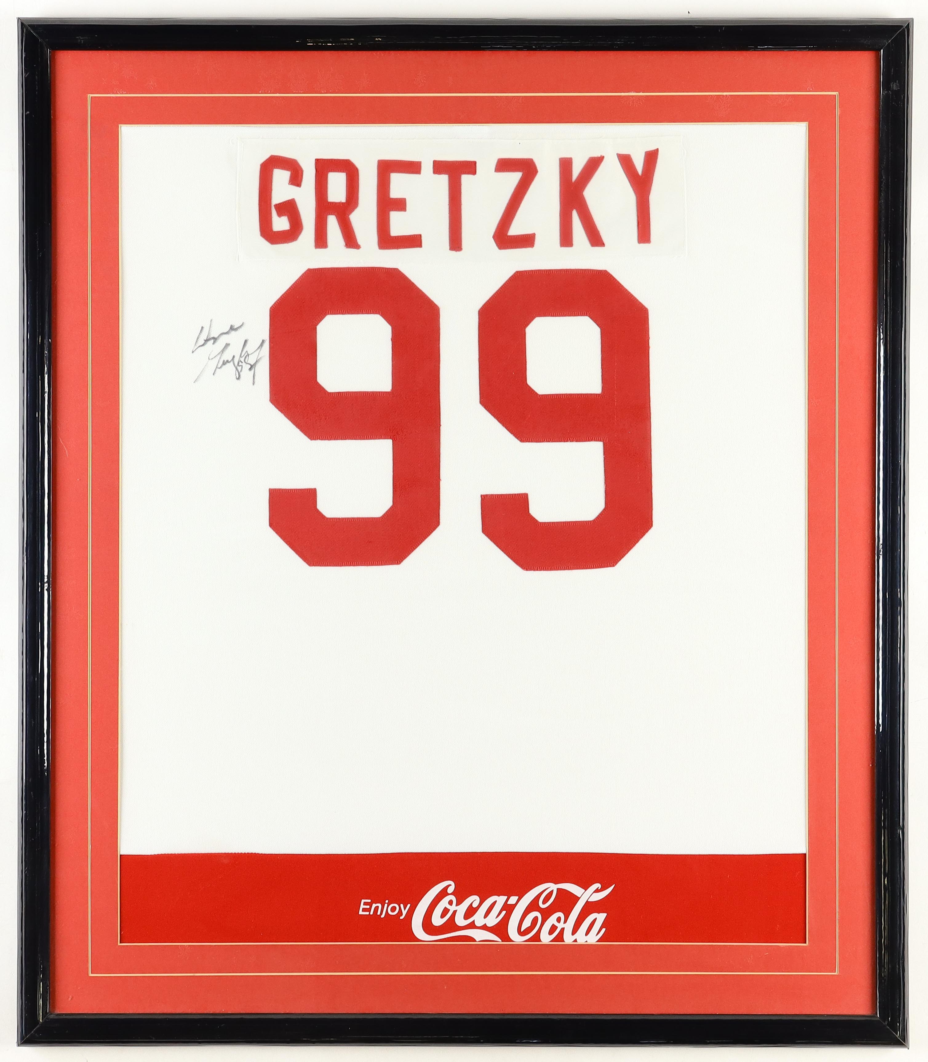 Custom frame measures 30" x 34" in size. Features a jersey that has been hand-signed by Wayne Gretzky (HOF).
