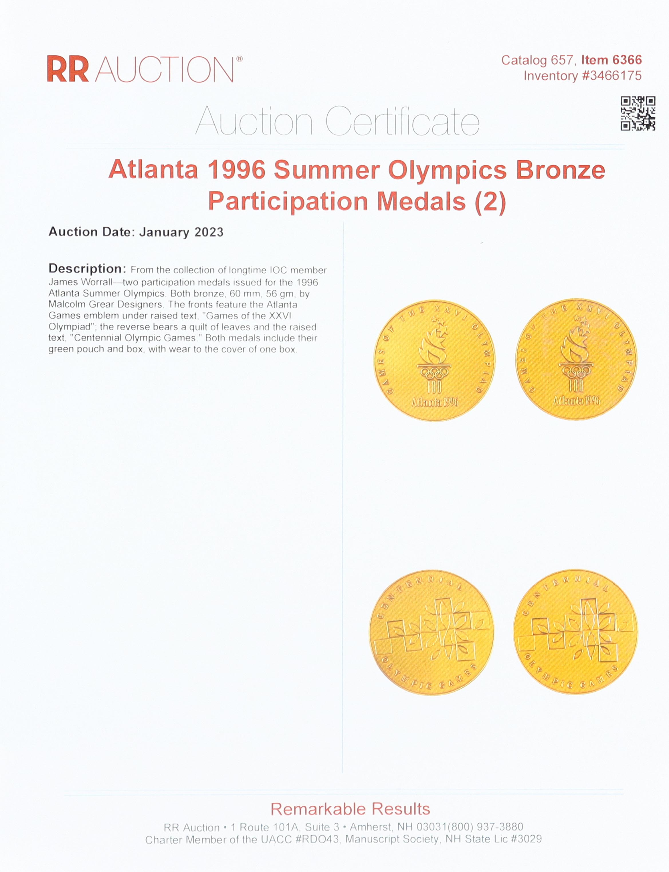 From the collection of longtime IOC member James Worrall—two participation medals issued for the 1996 Atlanta Summer Olympics. Both bronze, 60 mm, 56 gm, by Malcolm Grear Designers. The fronts feature the Atlanta Games emblem under raised text, "Games of the XXVI Olympiad"; the reverse bears a quilt of leaves and the raised text, "Centennial Olympic Games." Both medals include their green pouch and box, with wear to the cover of one box.