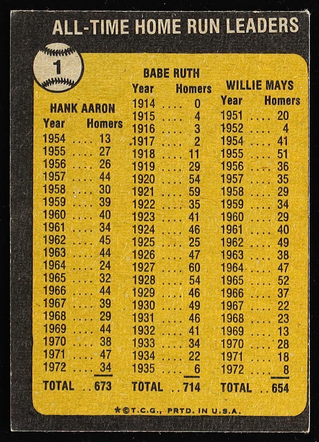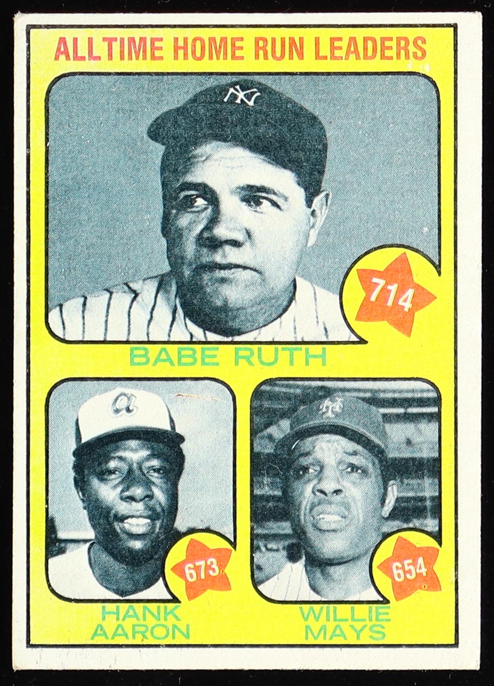 Babe Ruth 714 / Hank Aaron 673 / Willie Mays 654 1973 Topps #1 / All-Time Home Run Leaders