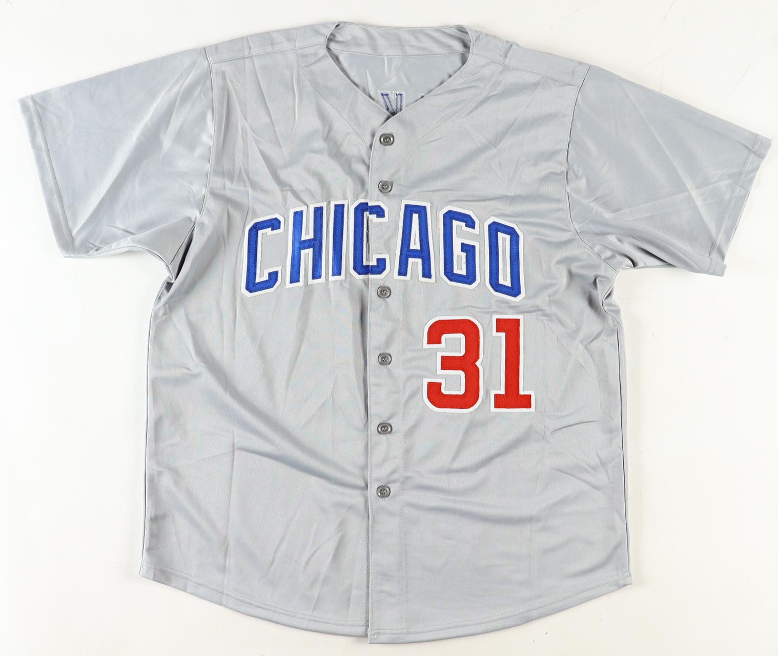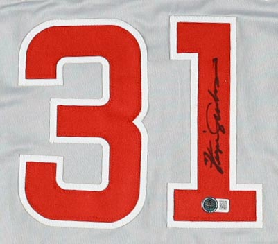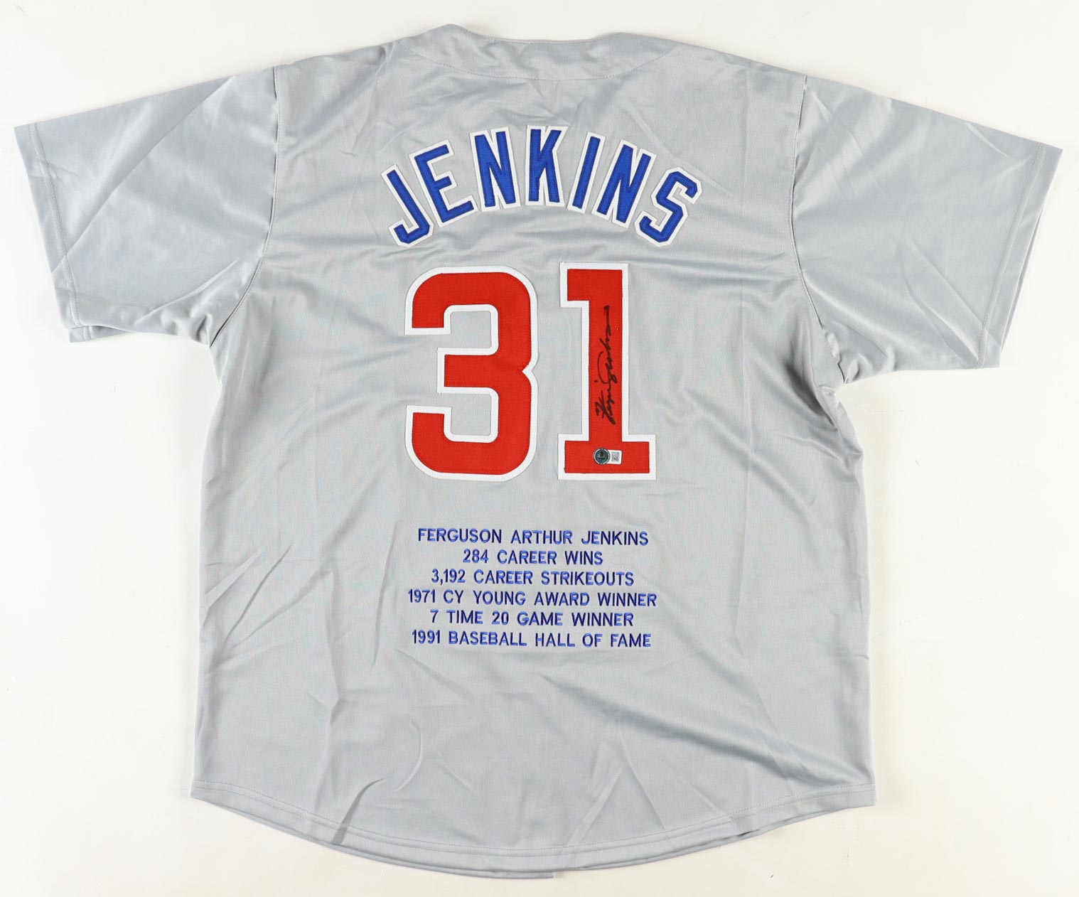 Custom jersey. Everything sewn on, size XL. Hand-signed by Ferguson Jenkins. Jenkins' career highlights have been custom stitched onto the back of the jersey below the reverse numbers.