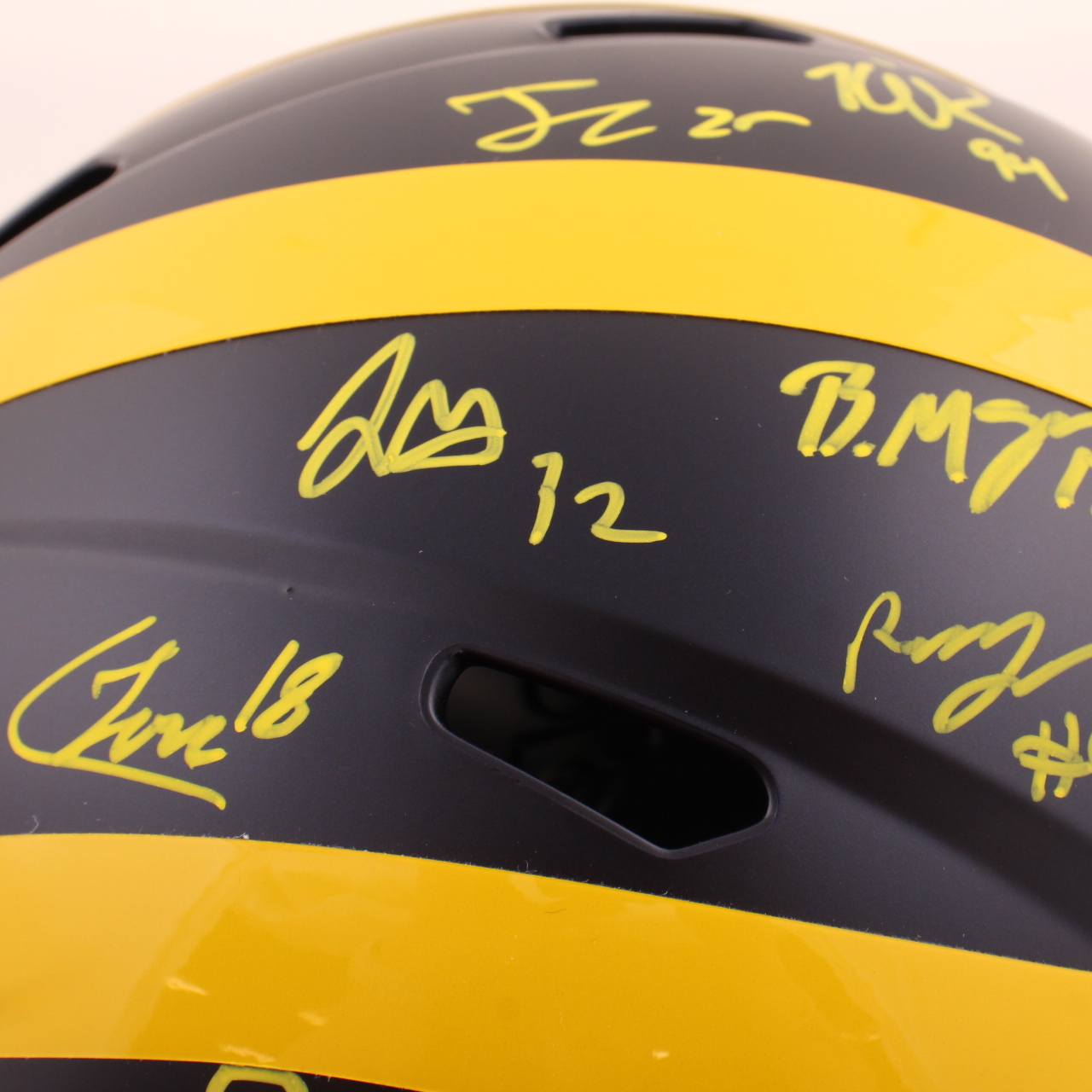 Riddell Michigan Wolverines full-size replica Speed helmet. Hand-signed and inscribed by (17) members of the 2023 Michigan Wolverines National Championship team. Signers include J.J. McCarthy, Max Bredeson, Mike Sainristil, Colston Loveland, Will Johnson, Mason Graham, Derrick Moore, Semaj Morgan, Makari Paige, Myles Hinton, Kalel Mullings, Kenneth Grant, Josiah Stewart, Ernest Huusmann, Blake Corum, Quentin Johnson and Tommy Doman.