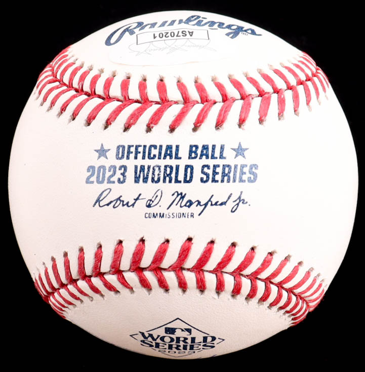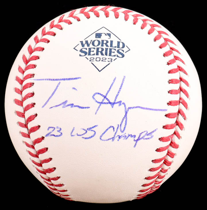 Rawlings Official 2023 World Series Logo baseball. Hand-signed and inscribed by Tim Hyers (Hitting Coach, Texas Rangers).