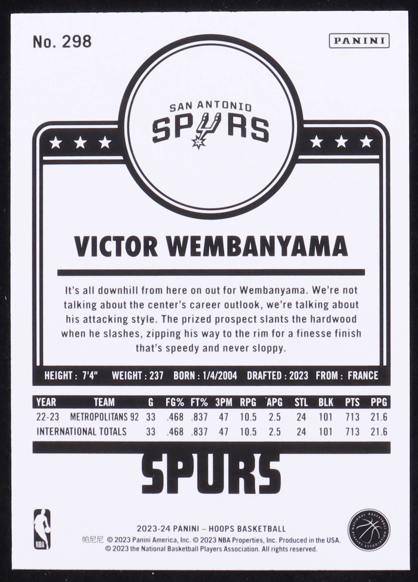 Victor Wembanyama 2023-24 Hoops #298 RC