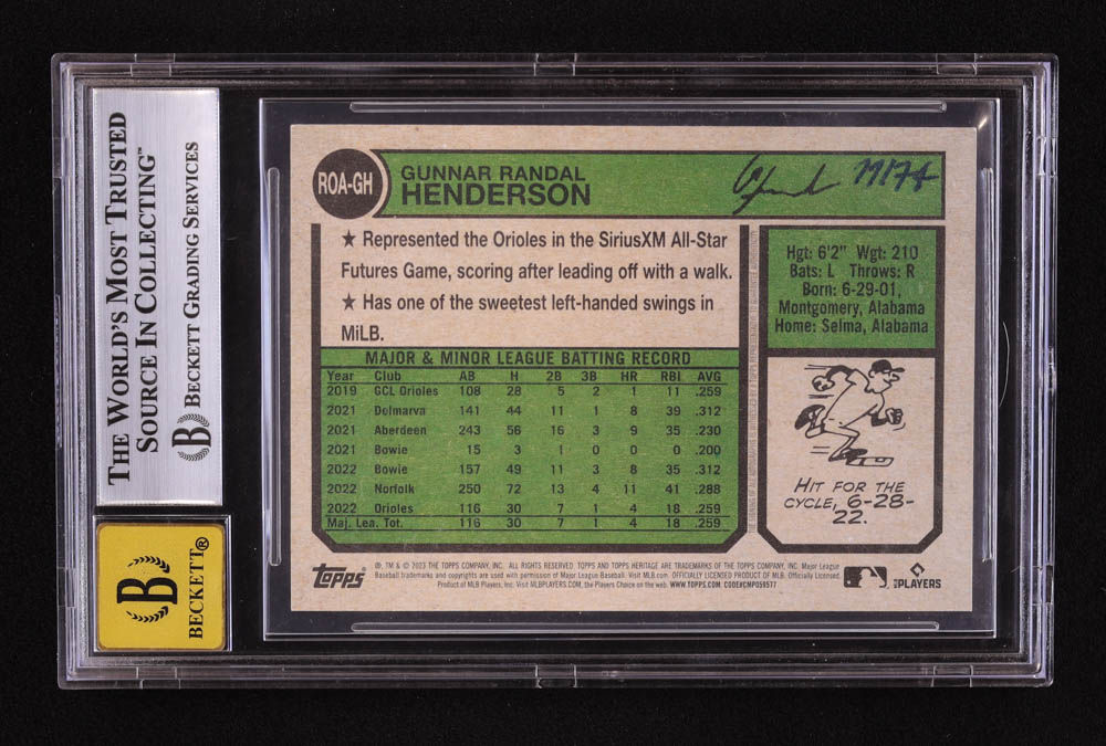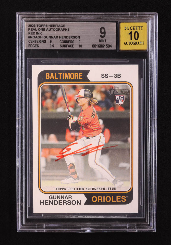 Gunnar Henderson 2023 Topps Heritage Real One Autographs Red Ink #ROAGH RC #11/74 (BGS 9)
