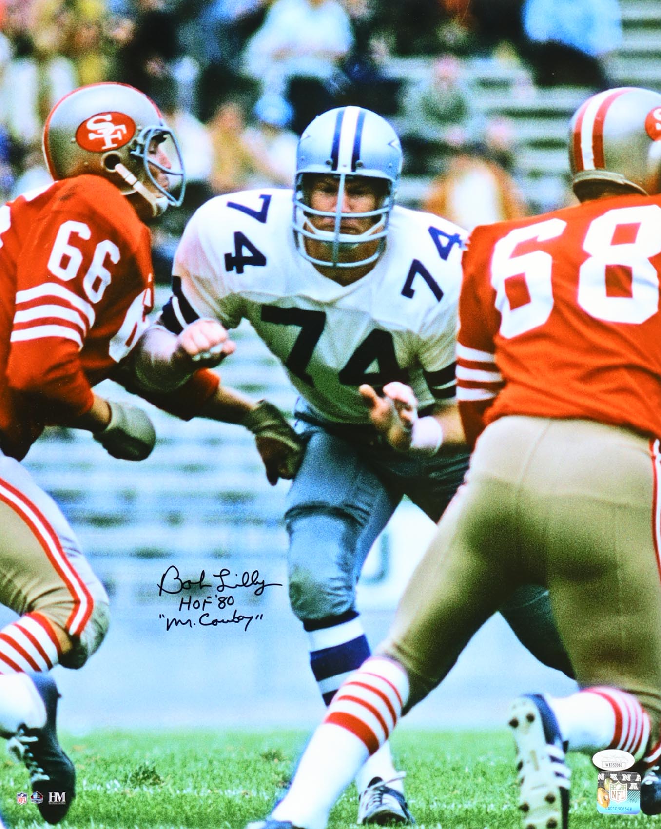 Photo measures 16" x 20" in size and has been hand-signed and inscribed by Bob Lilly (Dallas Cowboys, HOF).