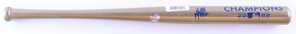 Houston Astros 2022 World Series Champions mini baseball bat measures 18" in length and has been hand-signed by Martin Maldonado (Houston Astros).